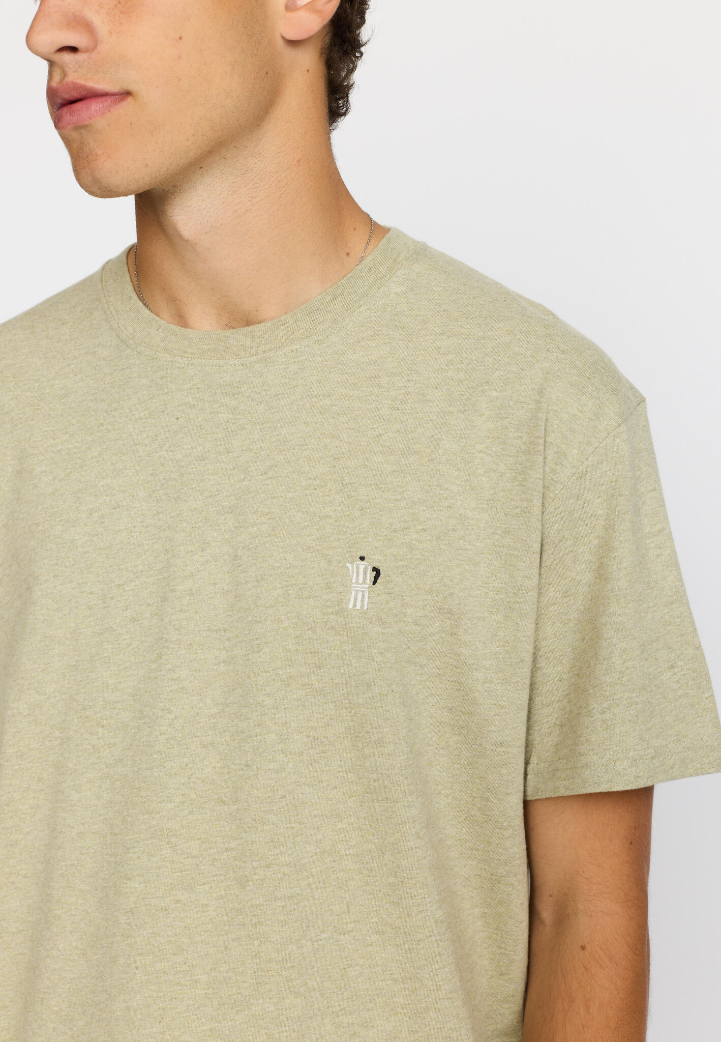 Losjes vallend T-shirt van gemêleerd biologisch katoenen jersey met een ronde ribkraag, korte mouwen en een kleine kleurrijke borduursel van een percolator op de borst. Dubbele naadomzoming aan de zoom.
