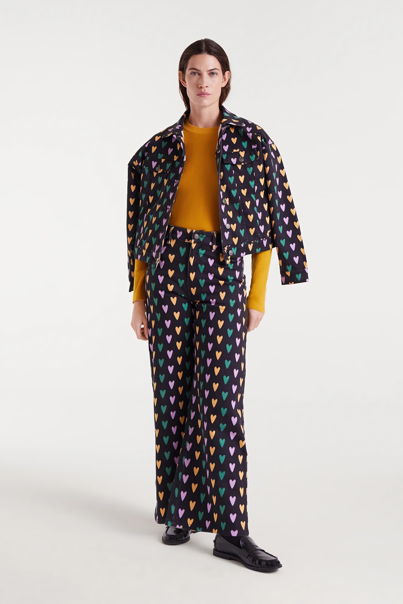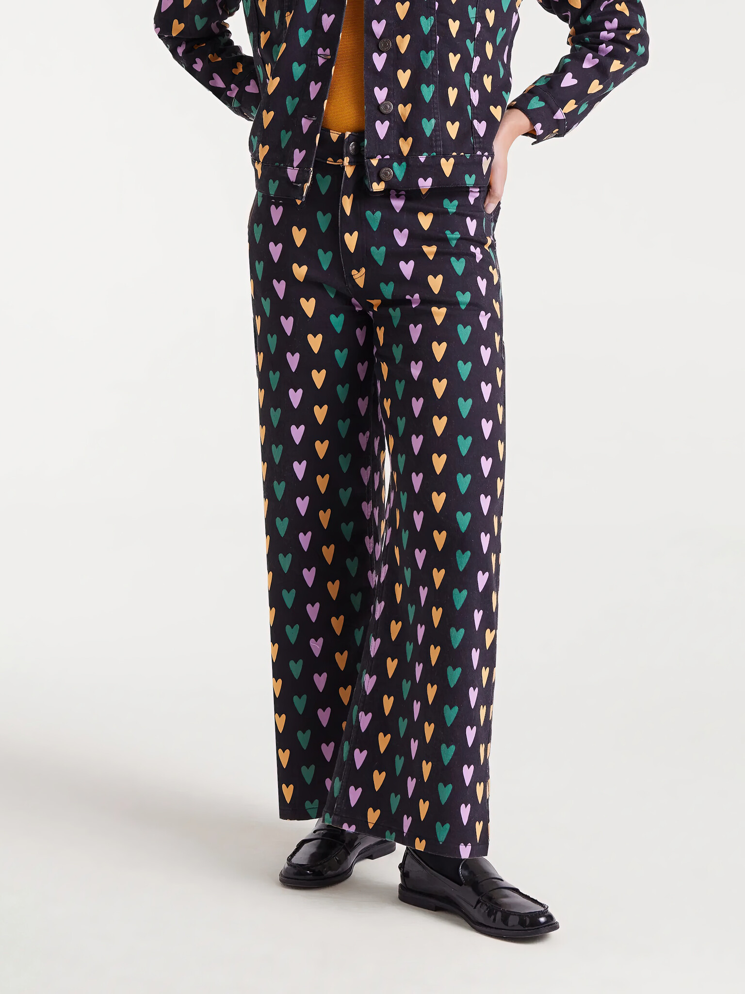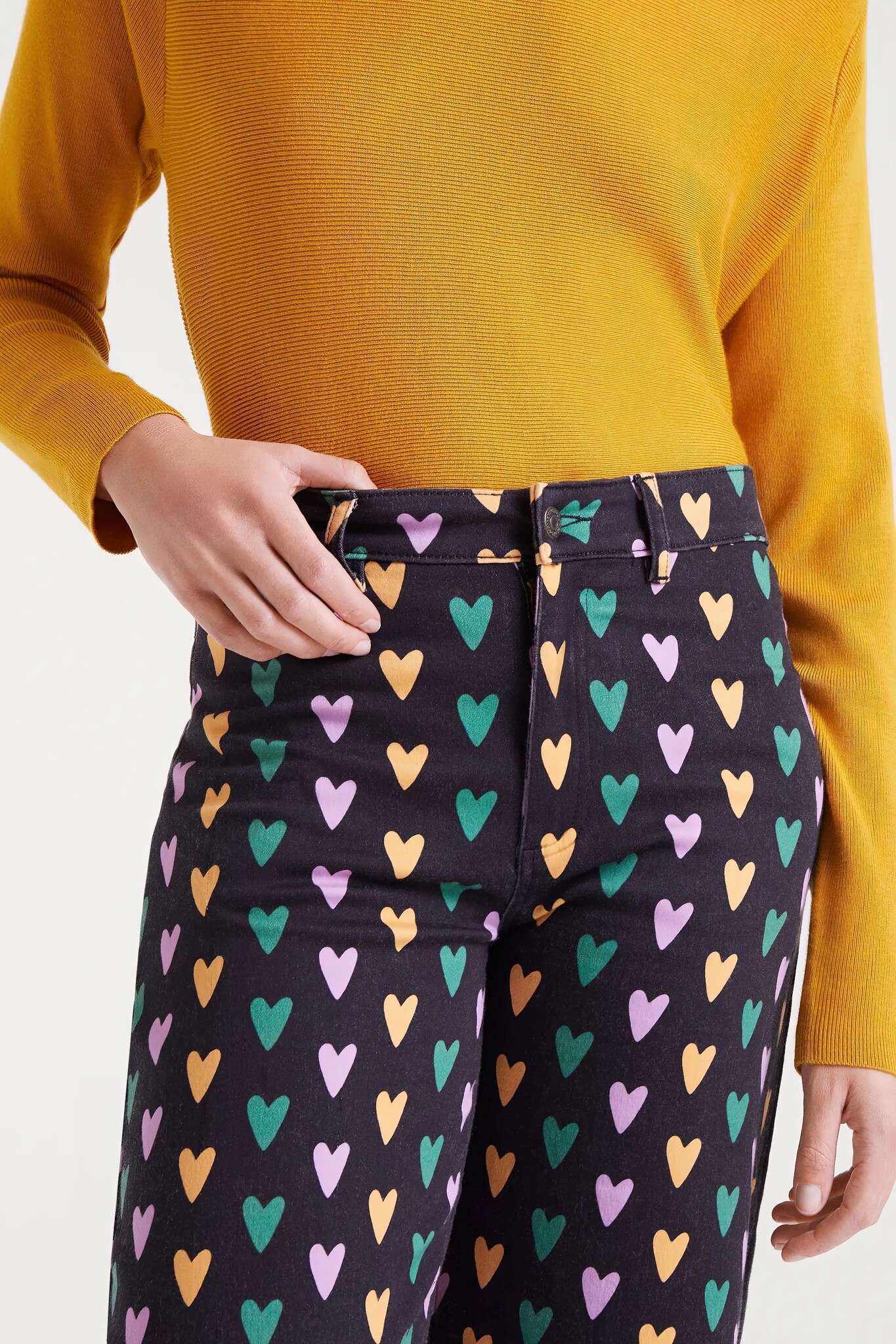 Jeans van stretchdenim met Cupid Lines-print, middelhoge taille en rechte pijpen. Ritssluiting met knoop, zij- en achterzakken.
