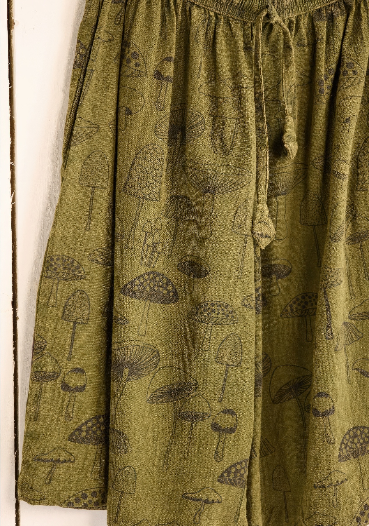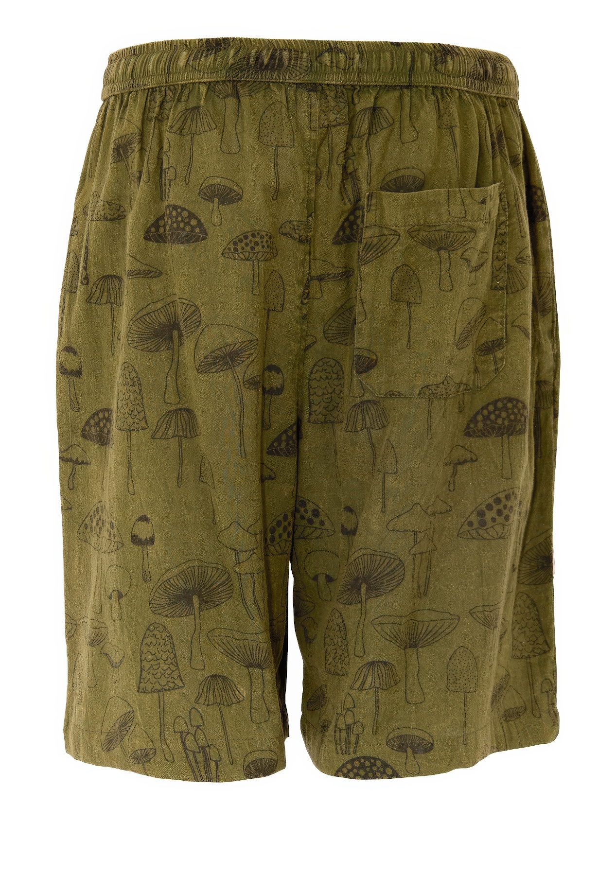 Unisex shorts van 100% katoen met paddenstoel print, elastische taille met decoratief koord, zijnaadzakken en een patchzak rechts achter. Handgeblokt of handzeefgedrukt. Fair Trade geproduceerd in Nepal.