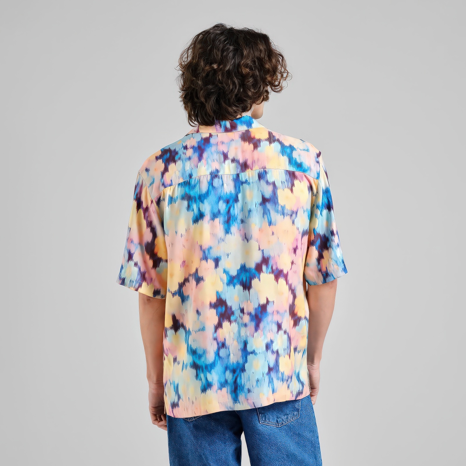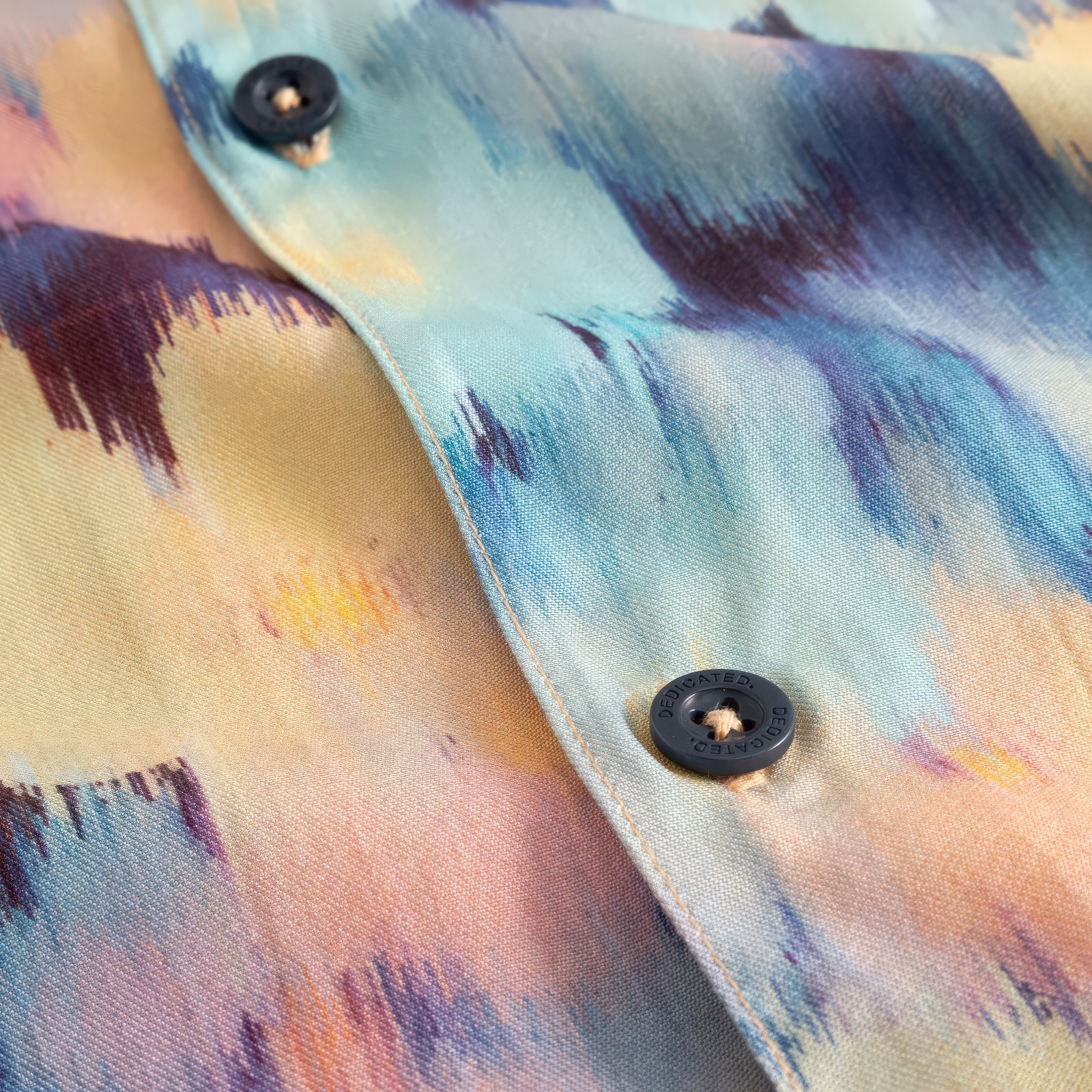 Losjes vallend resort overhemd met korte mouwen en een ikat print in blauw, teal, perzik, geel en paars met zachte, vloeiende vormen. Resort kraag, corozo knopen en borstzakje. Gemaakt van LENZING ECOVERO viscose.