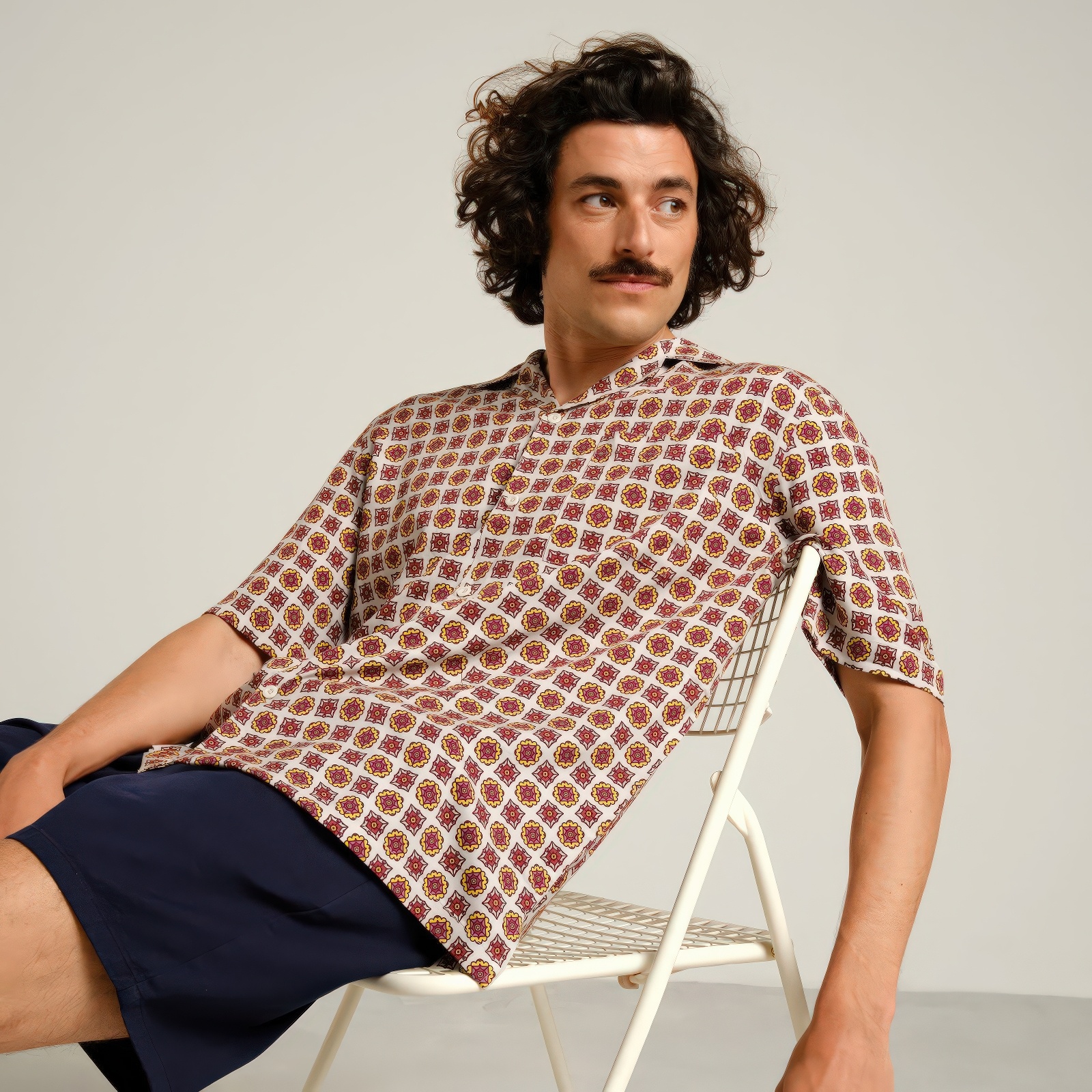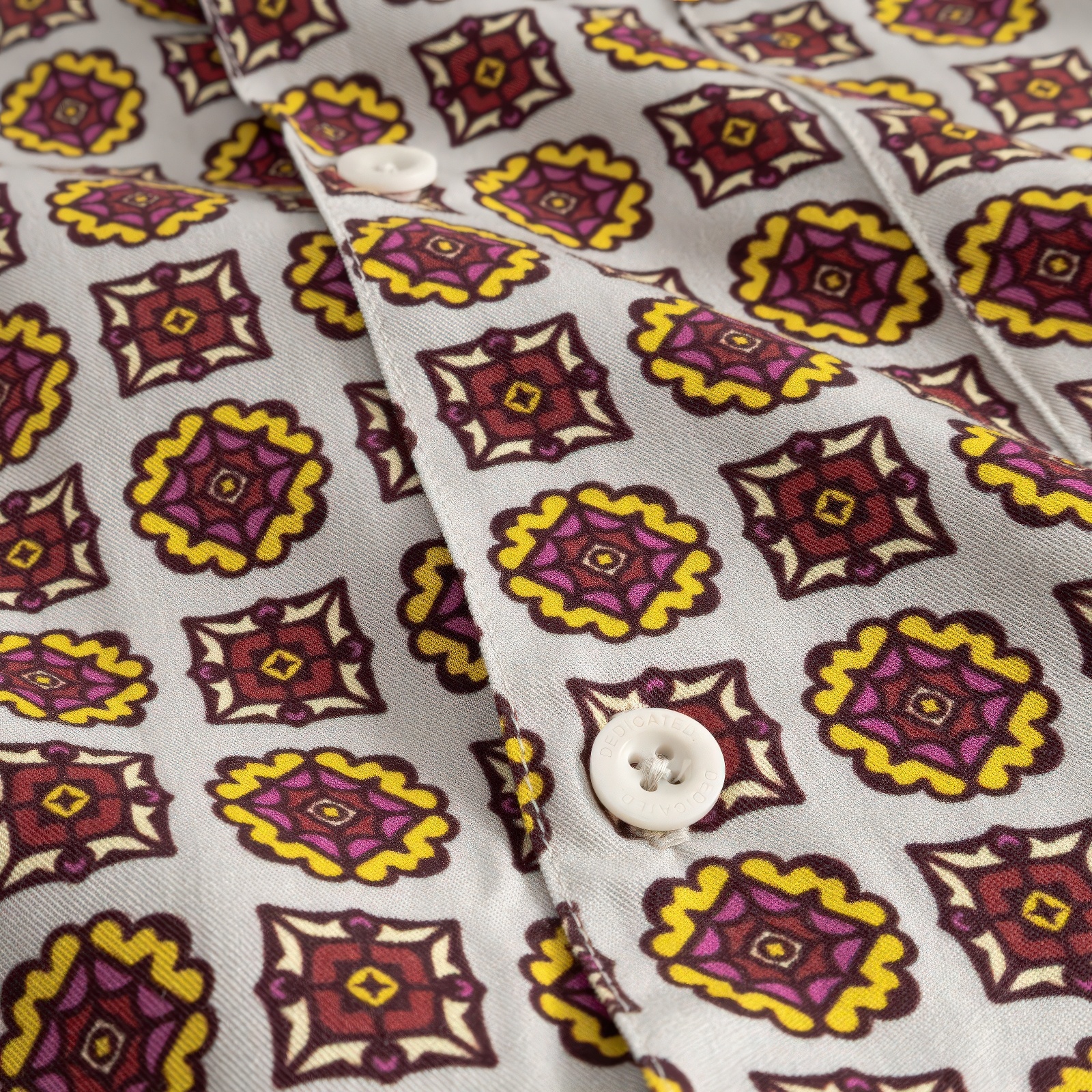 Losjes vallend resort overhemd met korte mouwen in gebroken wit met een medallion checks print in bordeaux, paars en geel. Resort kraag, corozo knopen en borstzakje. Gemaakt van LENZING ECOVERO viscose.