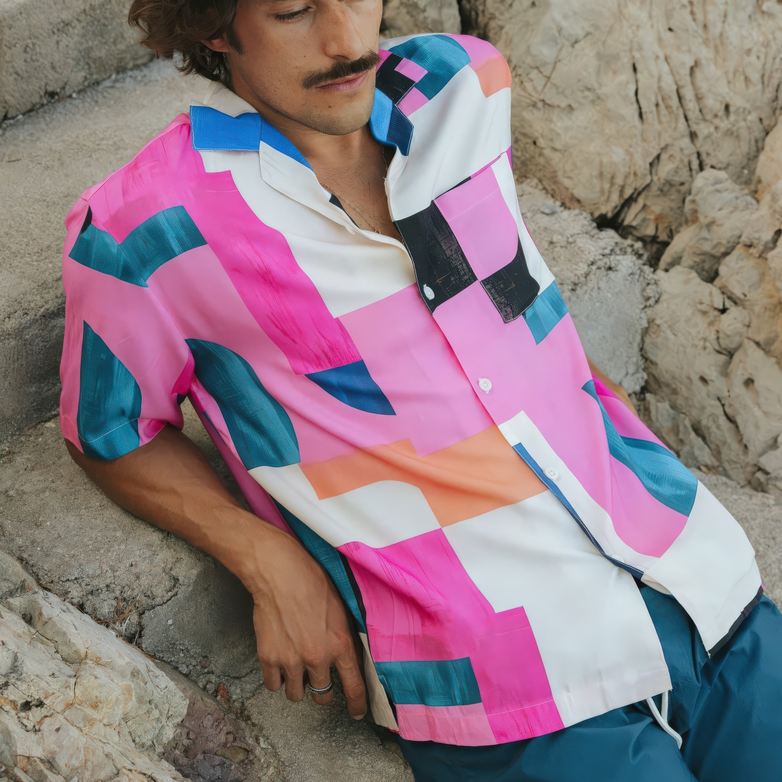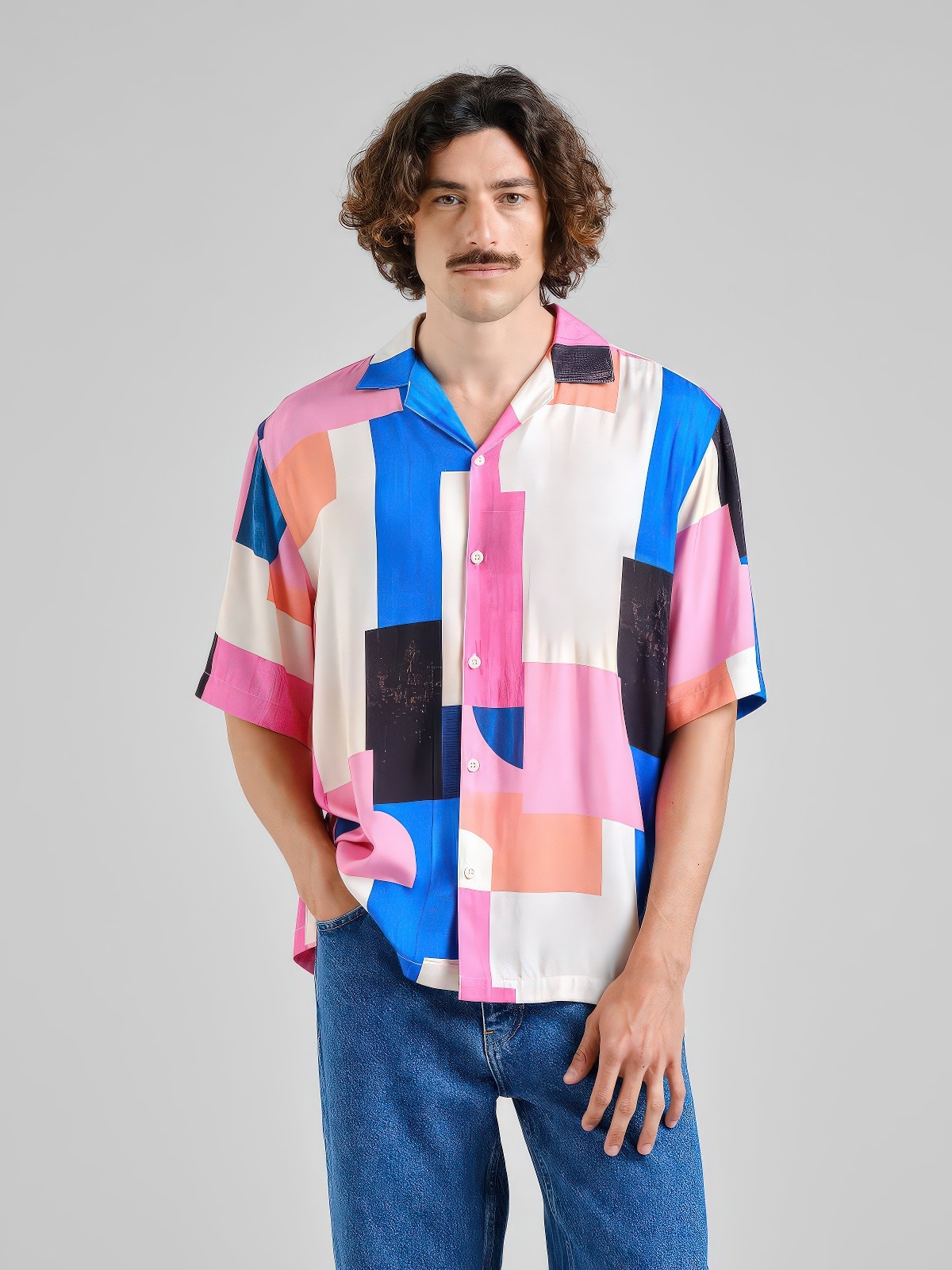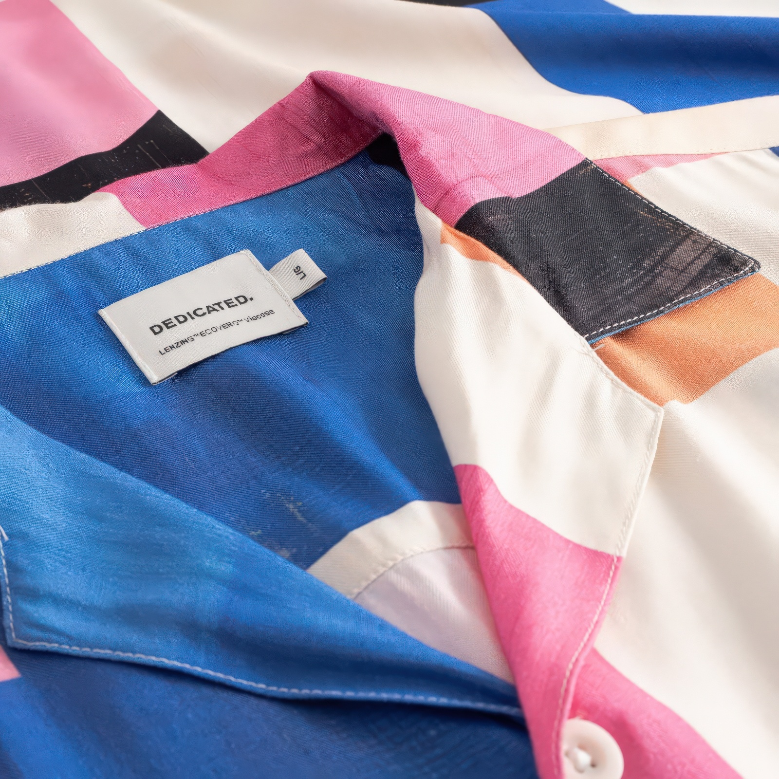 Losjes vallend resort overhemd met korte mouwen en een abstract blokkenprint met grote geometrische vormen en gebogen panelen in crème, blauw, roze, oranje en zwart. Resort kraag, corozo knopen en borstzakje. Gemaakt van LENZING ECOVERO viscose.