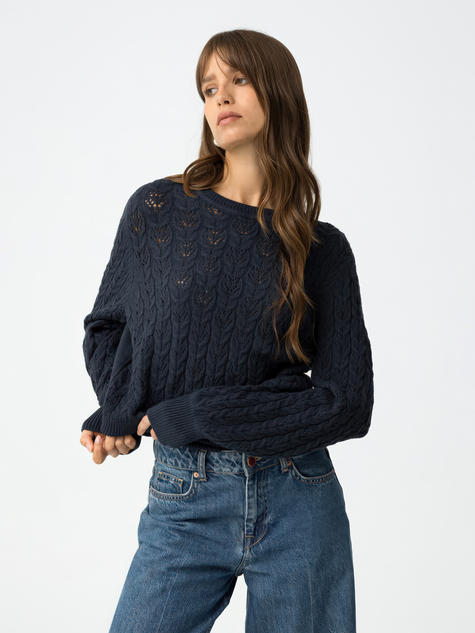 Regular fit kabelgebreide trui met opengewerkt patroon, ronde hals en lange mouwen.