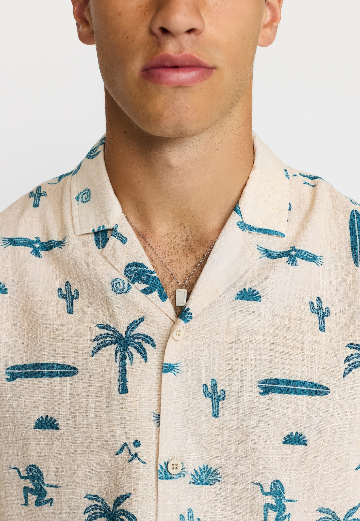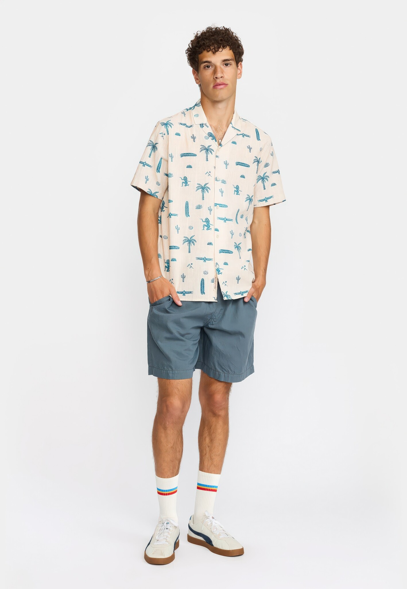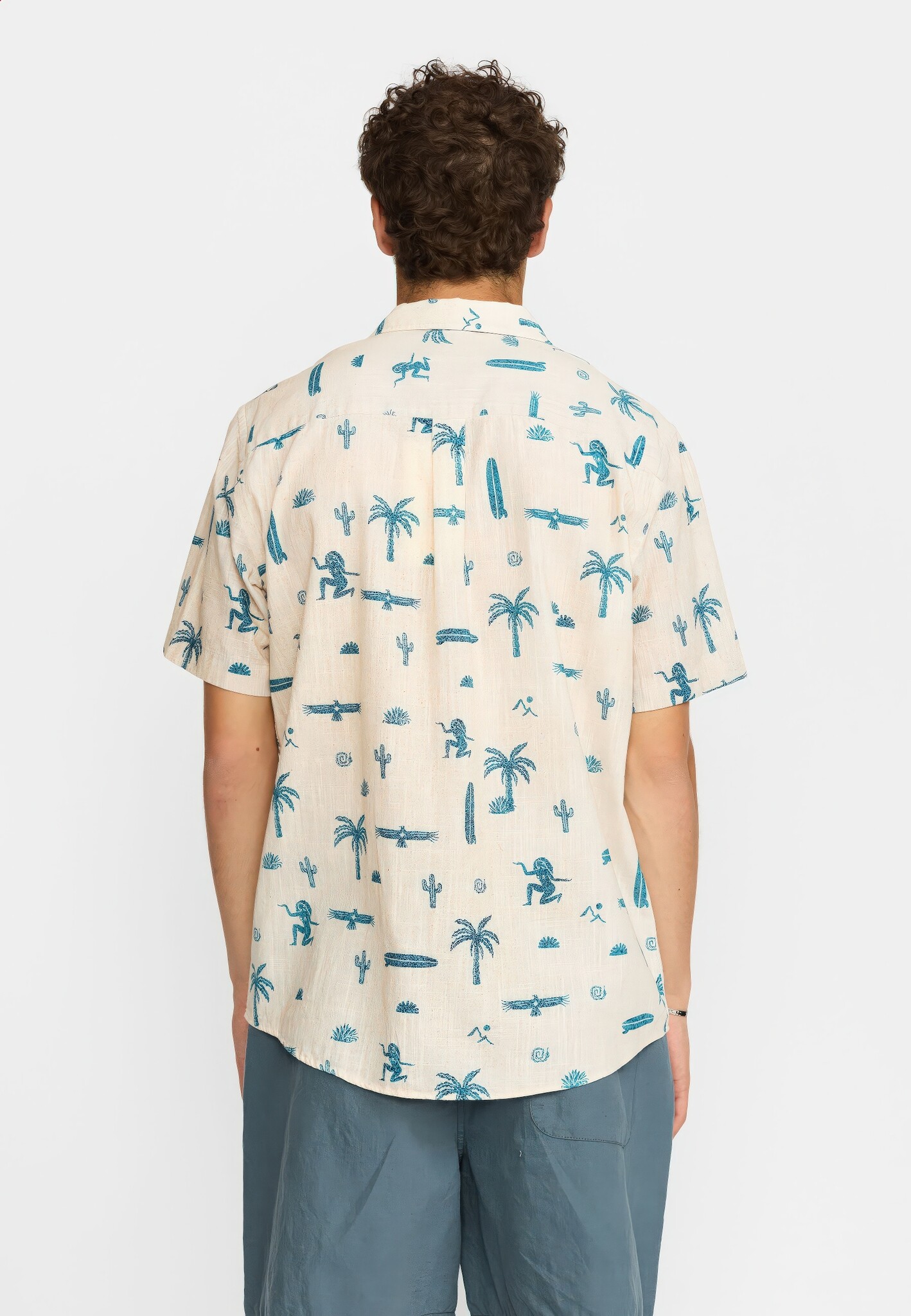 Kortgemouwd Cubaans overhemd van biologisch katoen in gebroken wit met all-over blauw Inca/Mexico patroon en grove structuur. Cubaanse kraag, toon-op-toon knopen, gebogen zoom en dubbele juknaad met boxplooi.