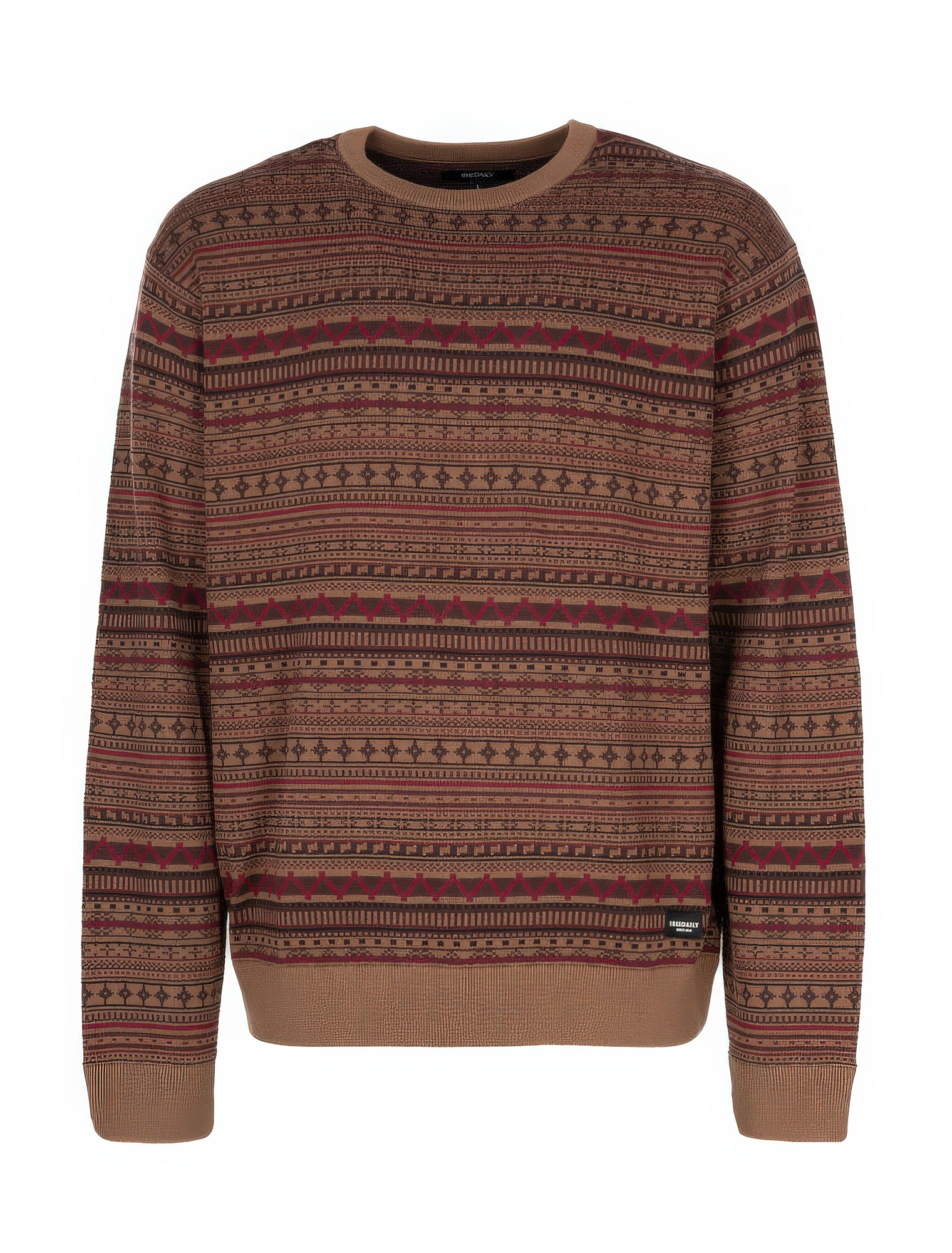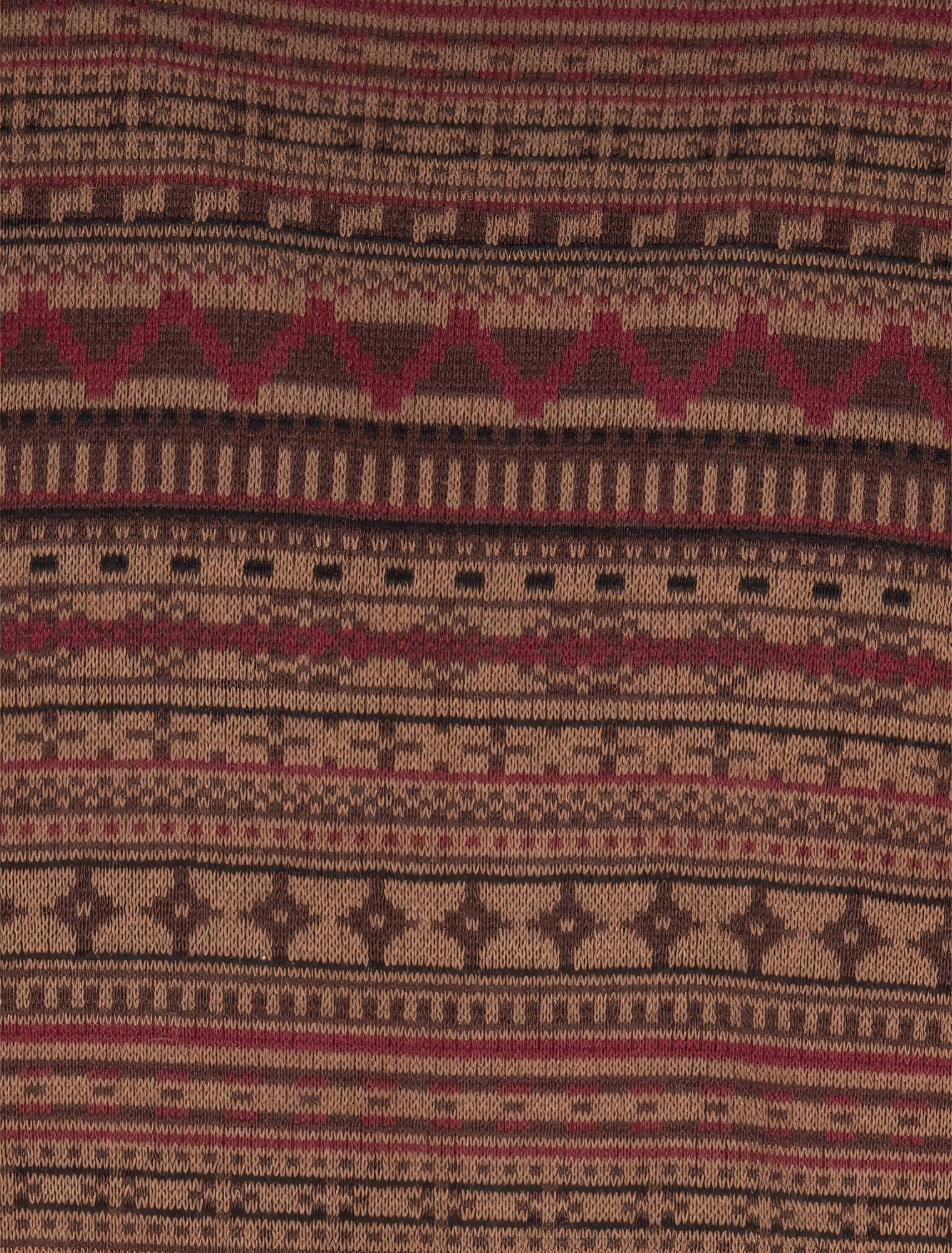 Fijngebreide trui in mocca-bruin met ronde hals, jacquard patroon en geribde boorden. Gemaakt van biologisch katoen.