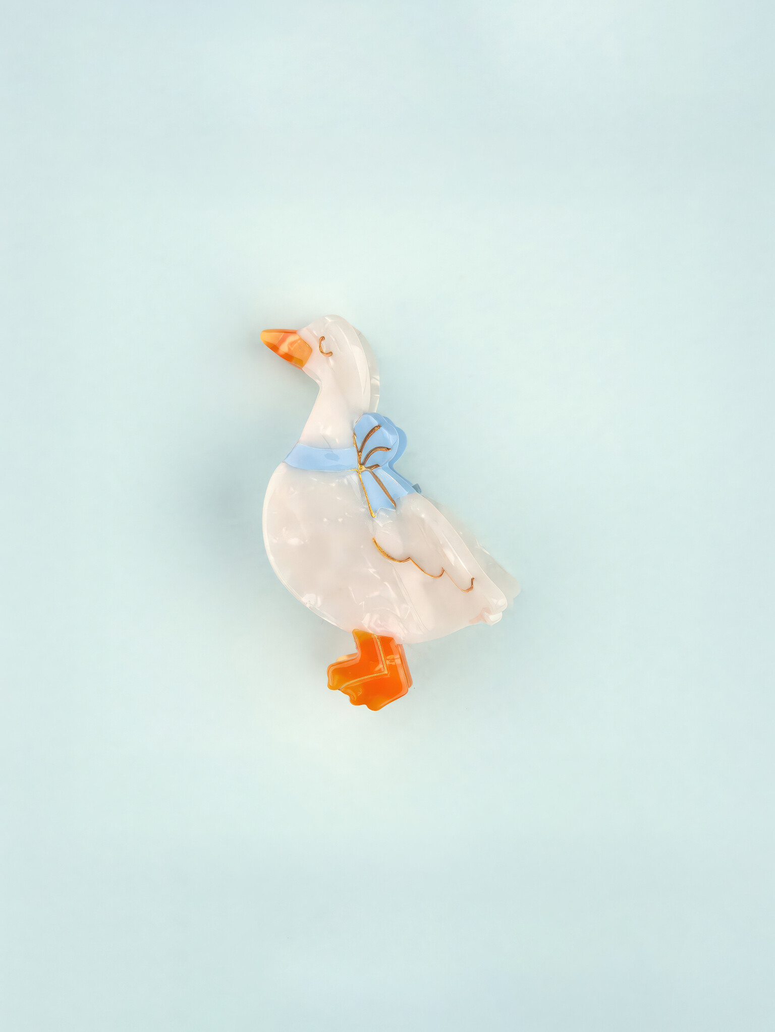 Kleine haarclip in de vorm van een gans met parelwitte veren en blauw lint, gemaakt van celluloseacetaat.