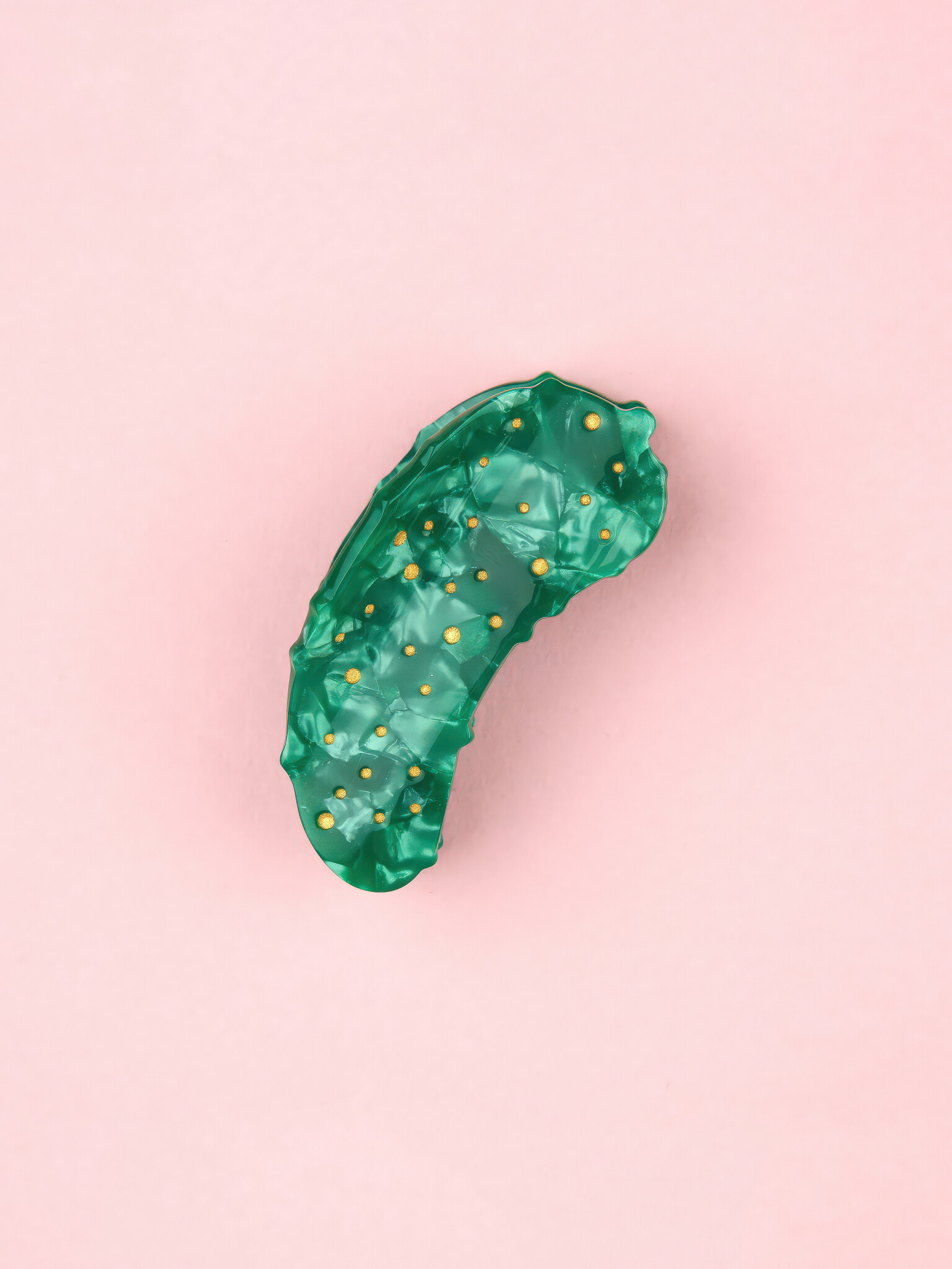 Mini haarclip in de vorm van een augurk in groen met gouden details, gemaakt van celluloseacetaat.