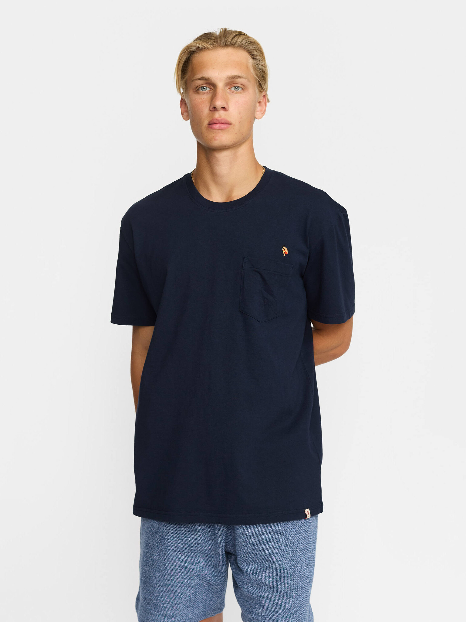Losjes vallend T-shirt met borstzakje, ronde hals en korte mouwen, gemaakt van biologisch katoenen jersey. Een kleine kleurrijke borduursel bij het borstzakje toont een duikende figuur.