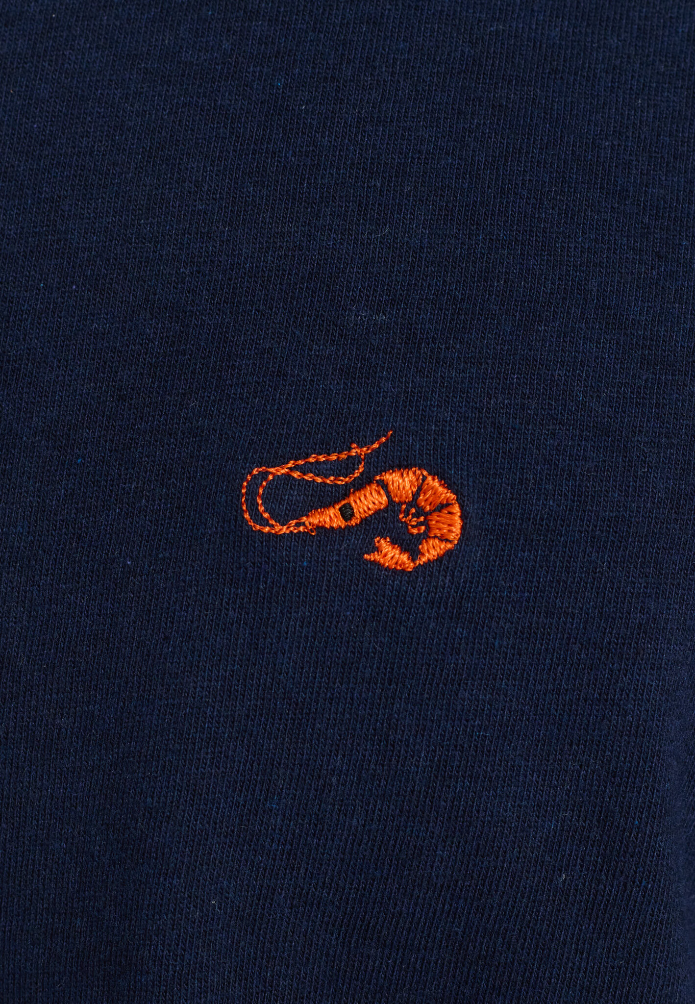 Losjes vallend marineblauw T-shirt van gemêleerd biologisch katoenen jersey met een ronde ribkraag, korte mouwen en een kleine kleurrijke borduursel van een garnaal op de borst. Dubbele naadomzoming aan de zoom.