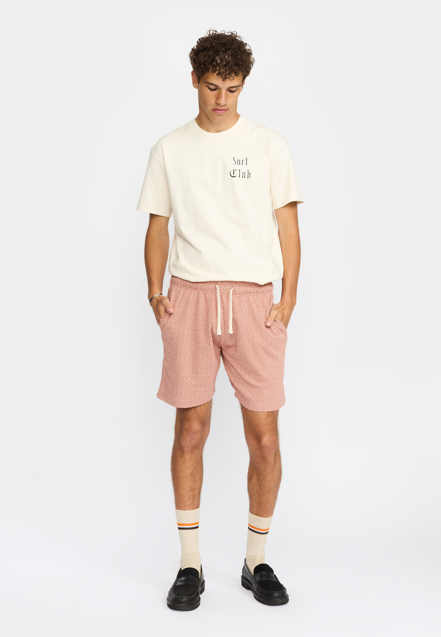 Shorts van zacht en stretchend biologisch katoenen jersey in stofblauw met een klein arlequin jacquardpatroon. Elastische taille met verstelbaar koord en twee schuine steekzakken.