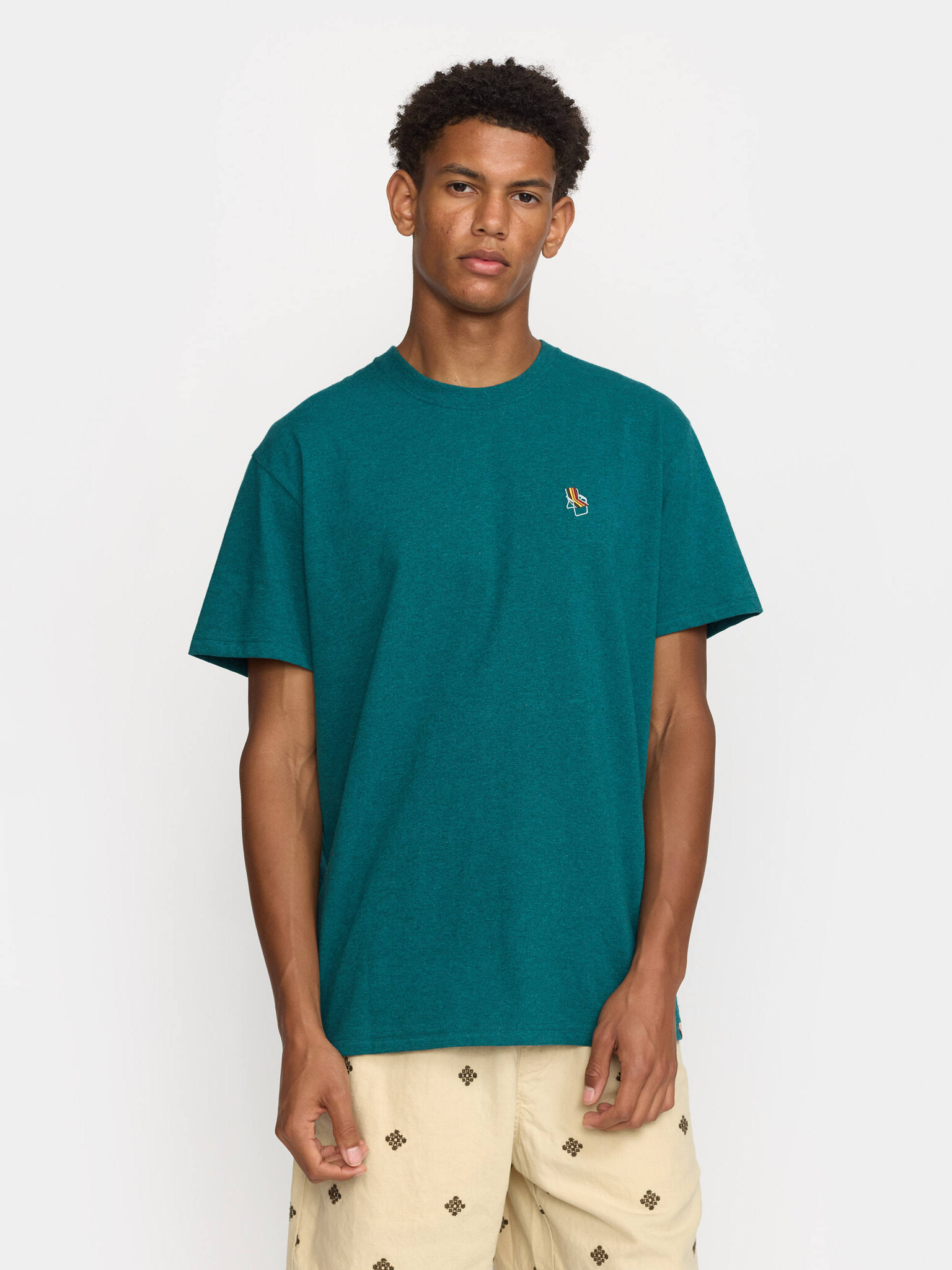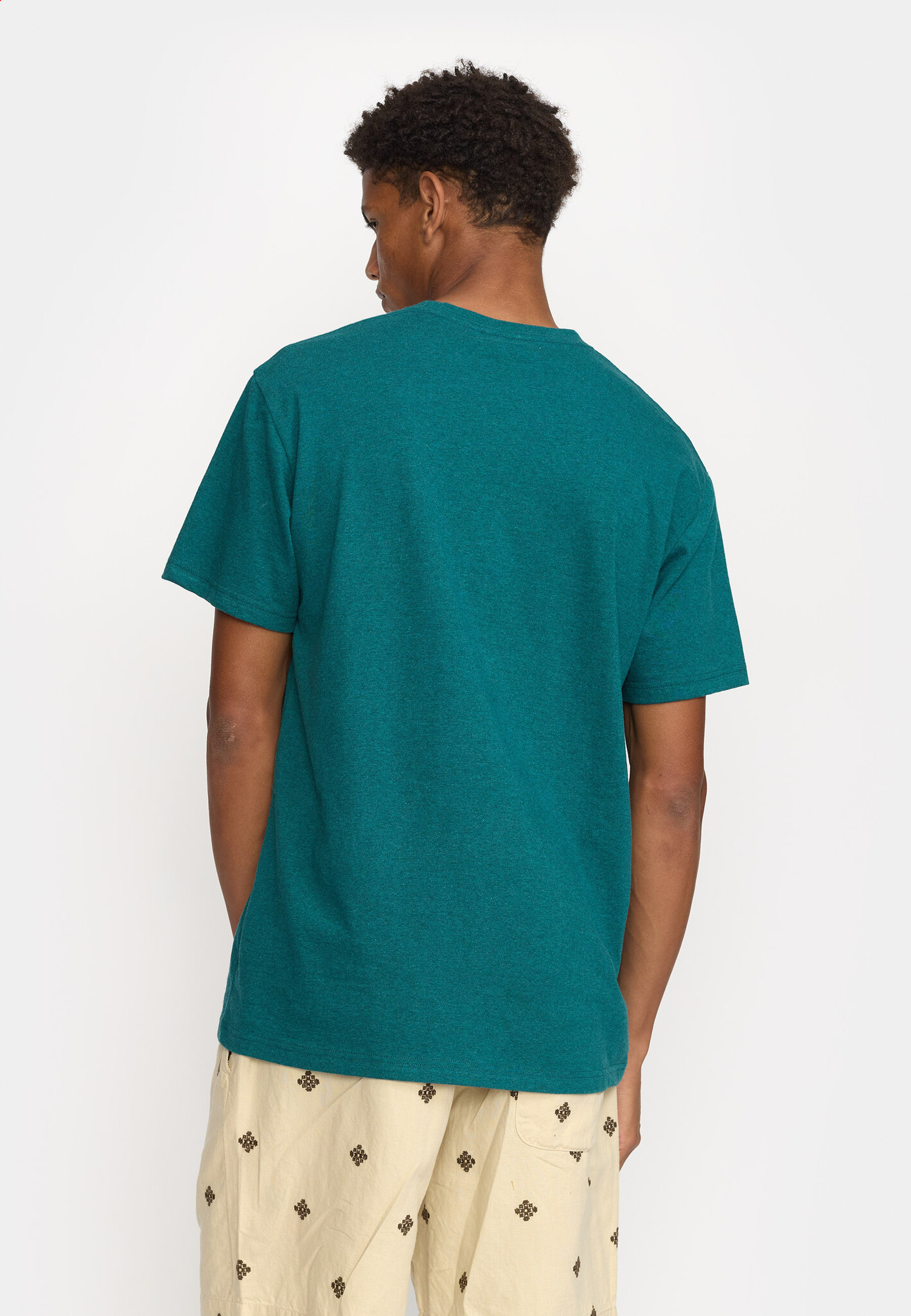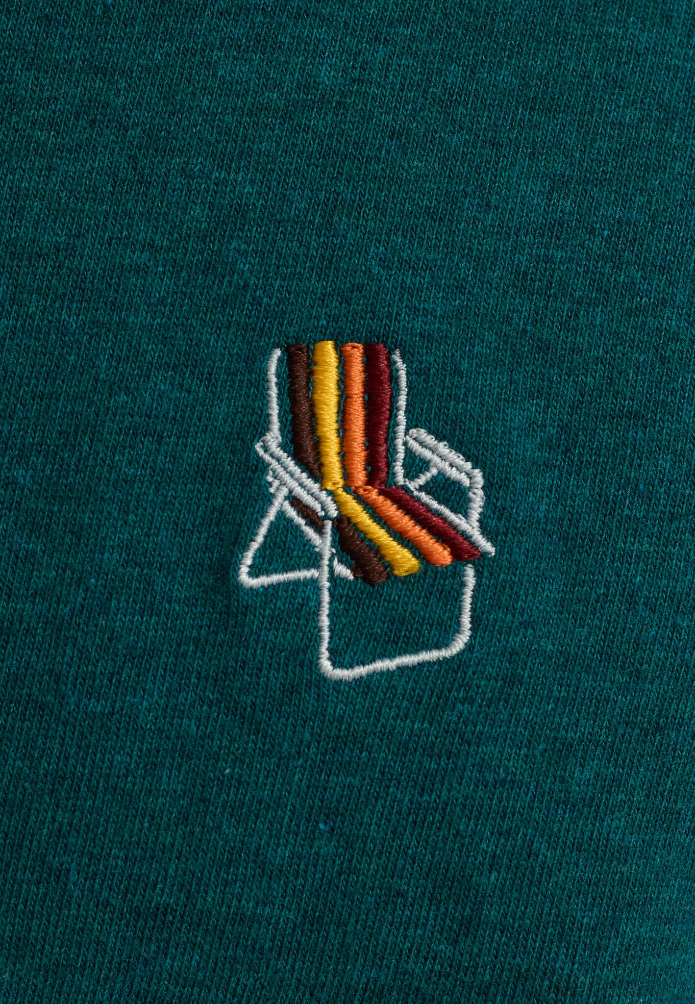 Losvallend T-shirt met ronde hals en korte mouwen, gemaakt van petrolkleurig gemêleerd biologisch katoentricot (200 g/m²). Voorzien van een klein, kleurrijk borduursel van een opvouwbare strandstoel op de borst.
