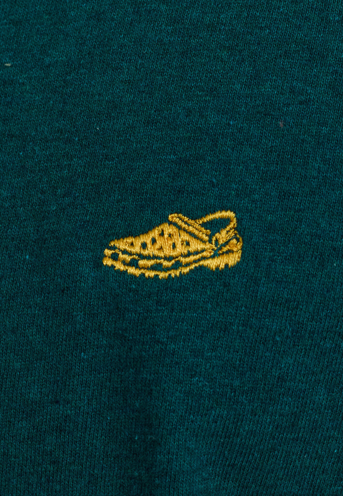 Losjes vallend petrolblauw T-shirt van gemêleerd biologisch katoenen jersey met een ronde ribkraag, korte mouwen en een kleine kleurrijke borduursel van een Croc-schoen op de borst. Dubbele naadomzoming aan de zoom.