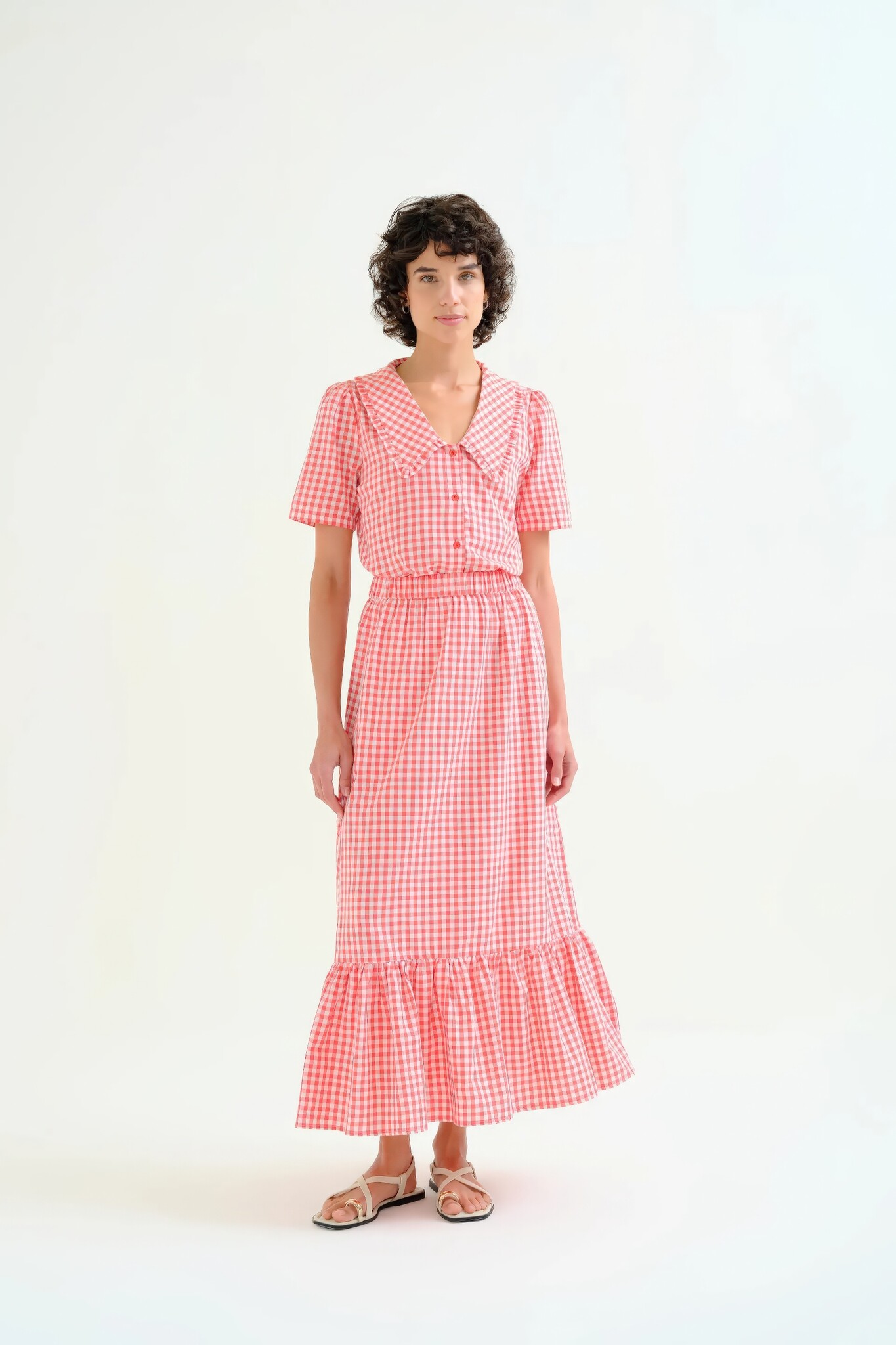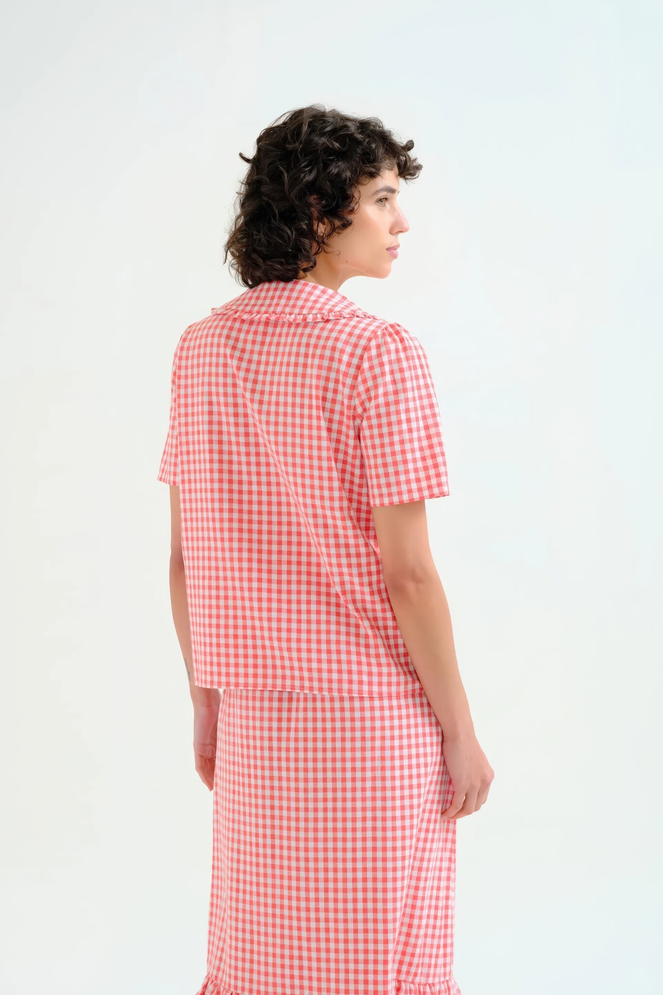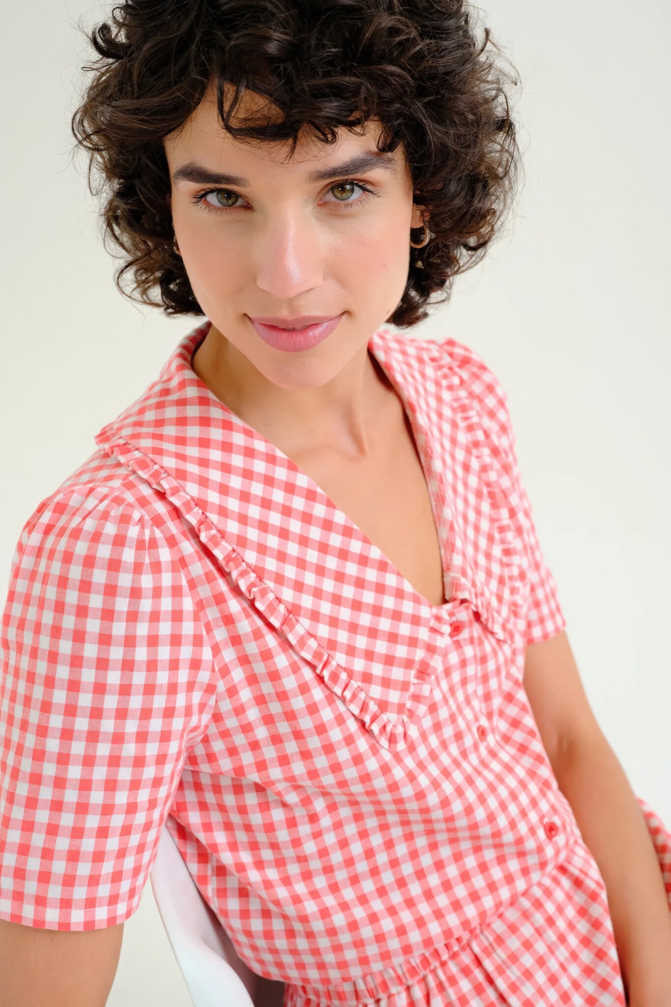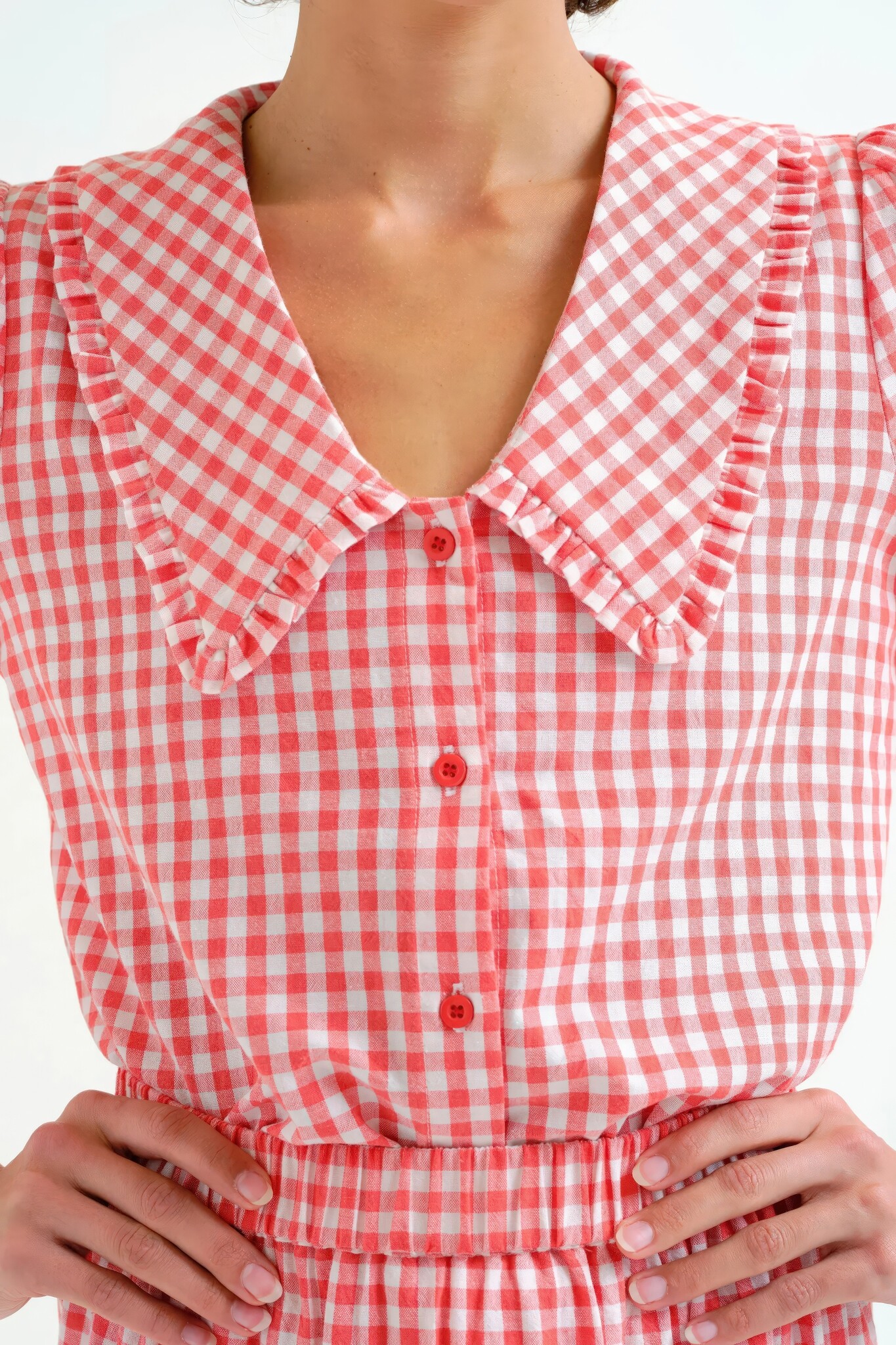 Kortgemouwd gingham overhemd van 100% katoen in rood met een Peter Pan kraag en knoopsluiting aan de voorkant met rode knopen.