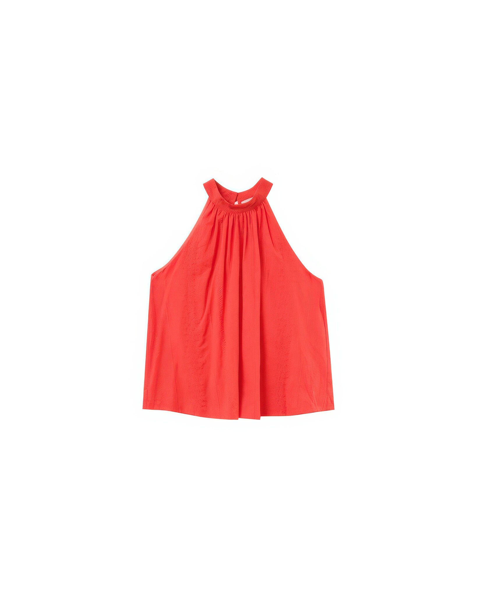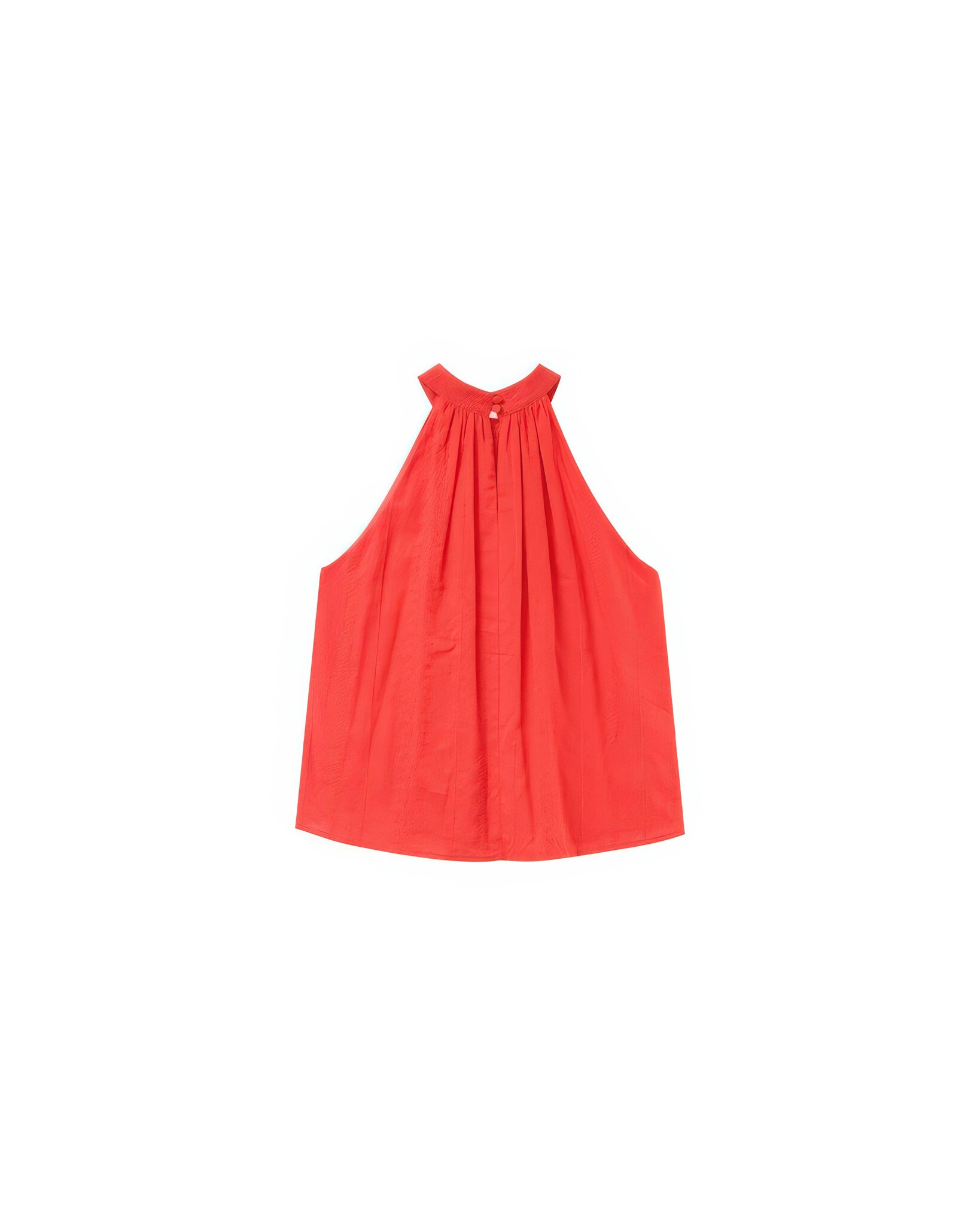 Mouwloze top met Engelse borduursels, een trapeze snit en een open rug. Voorzien van een opstaande kraag met knoopsluiting en plooidetails bij de halslijn.