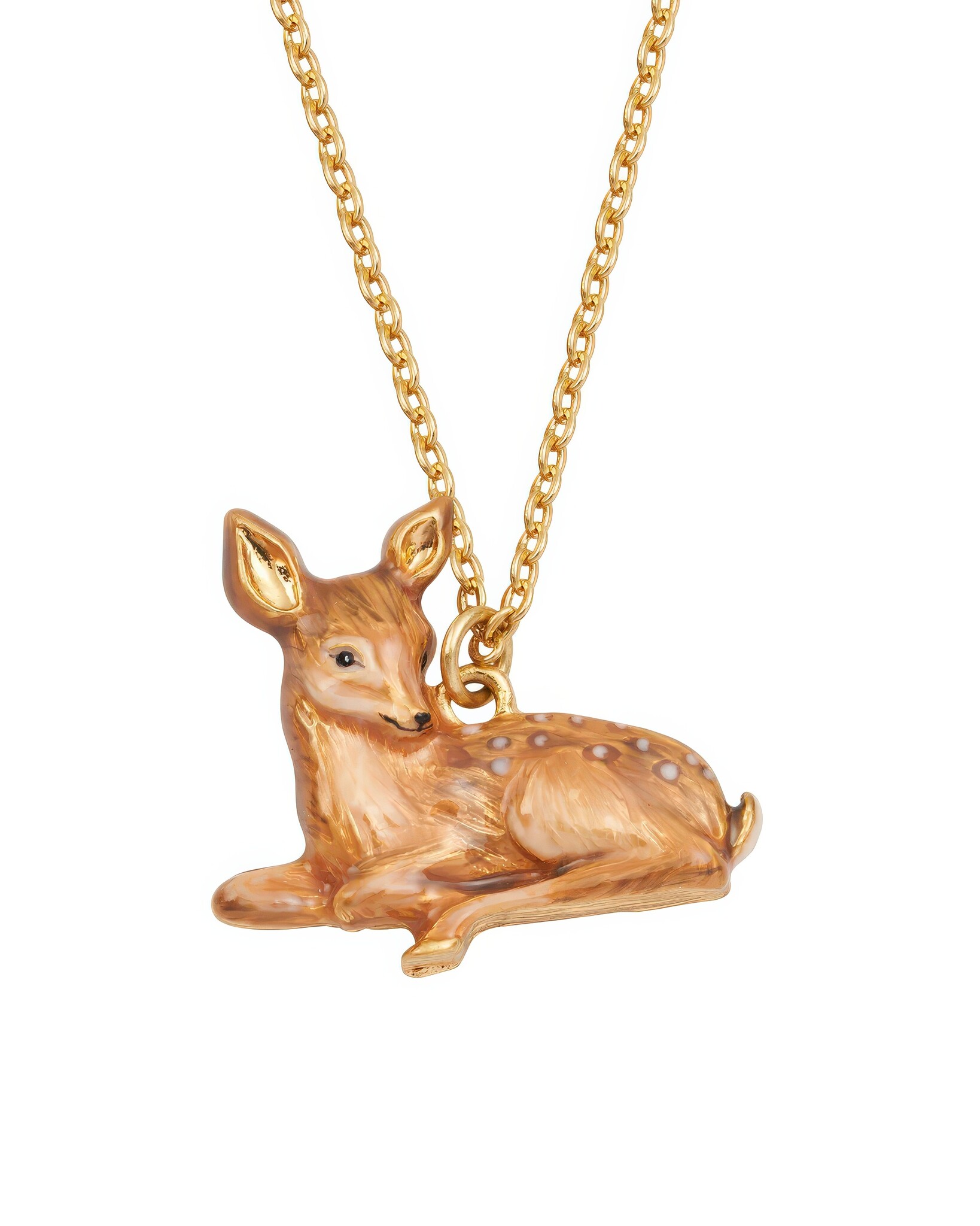 Gouden ketting van 22-karaats verguld messing met een handgeschilderde email hanger van een rustend hert. Kreeftensluiting met verstelbare kettinglengte.