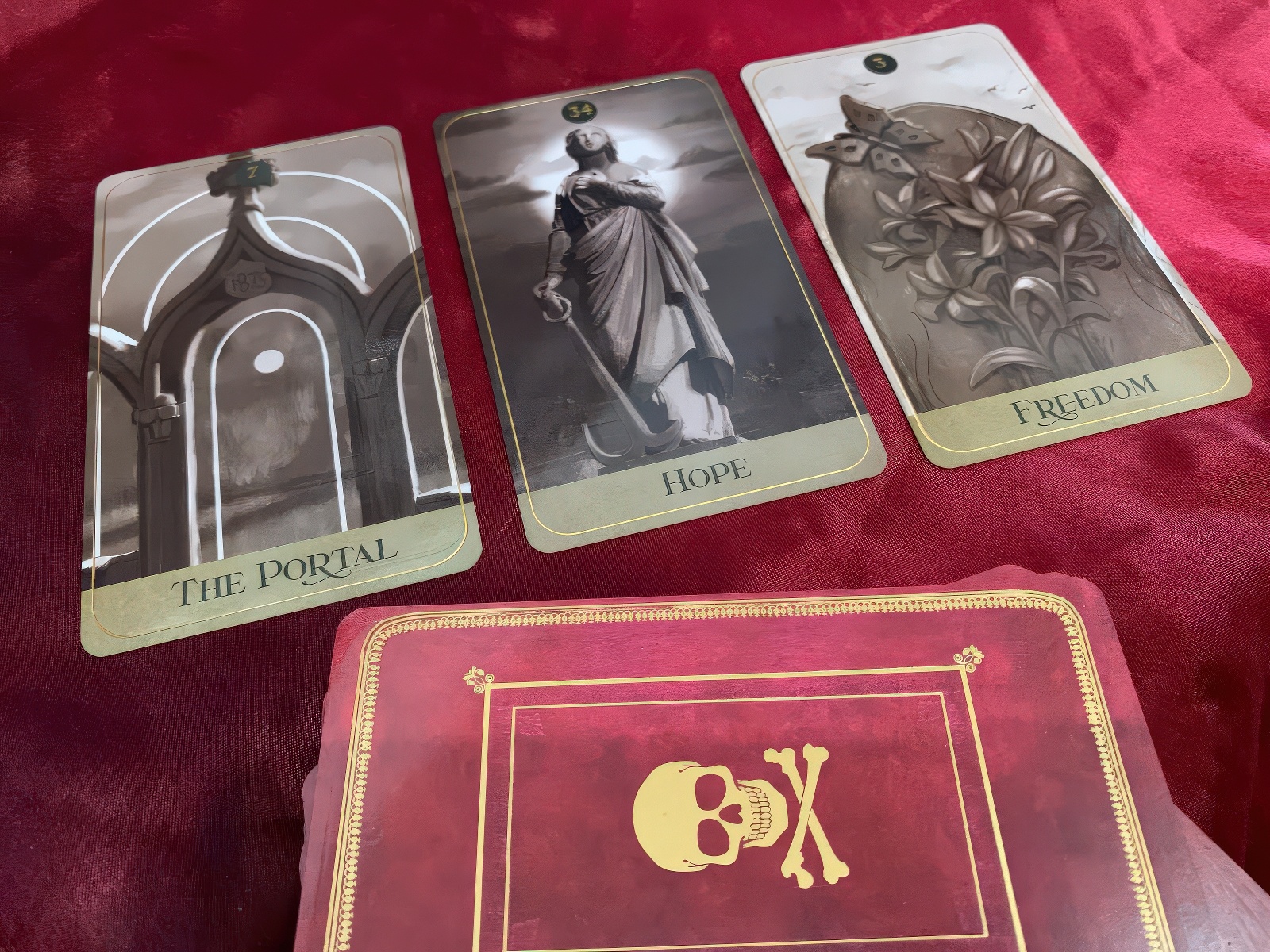 Oracledeck van Stacey Williams-Ng met goudgeëtste kaarten en gids in een fluweel gevoerde kistvormige doos. Winnaar Best Indie Deck 2023.
