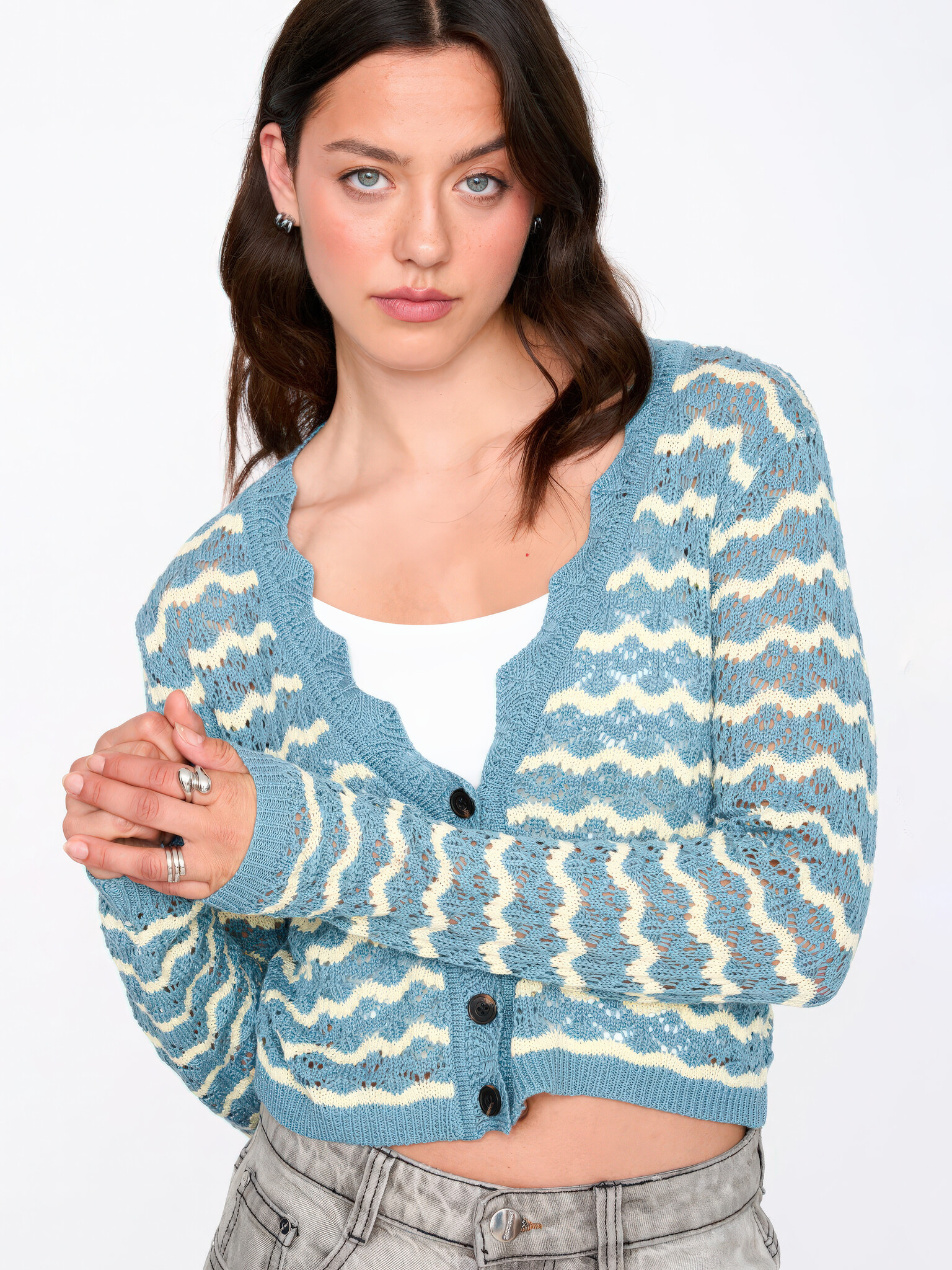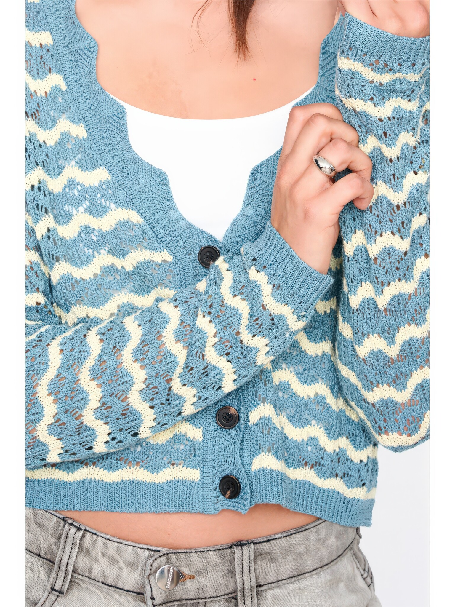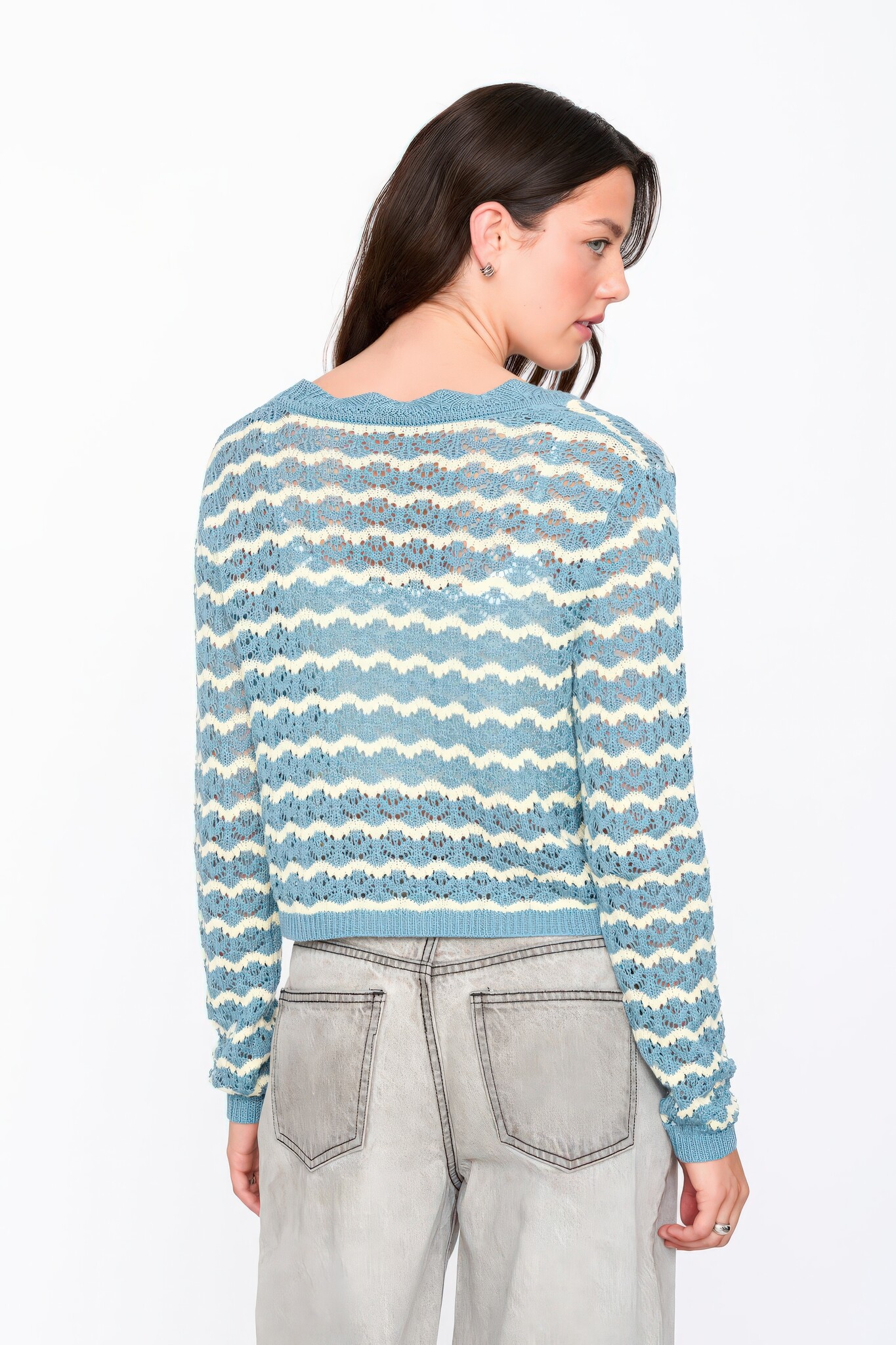 Kortgesneden opengewerkte gebreide cardigan in blauw met crèmekleurige zigzagstrepen. V-hals, lange mouwen, knoopsluiting en geribbelde manchetten en onderrand. Ruglengte 43 cm.
