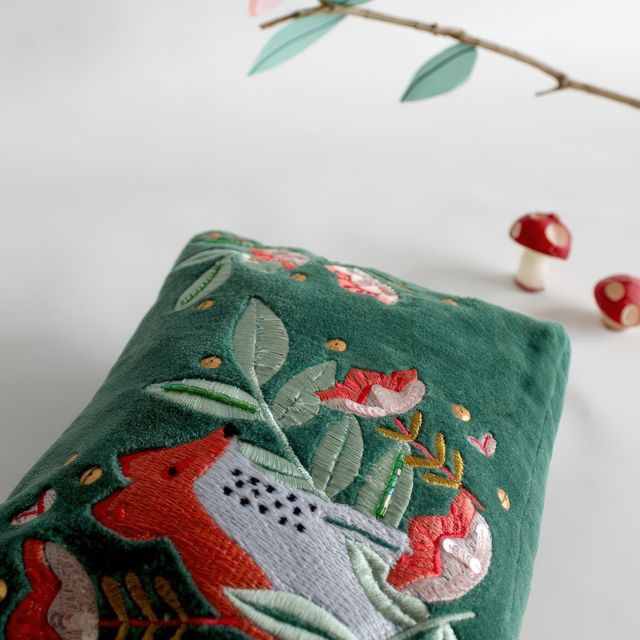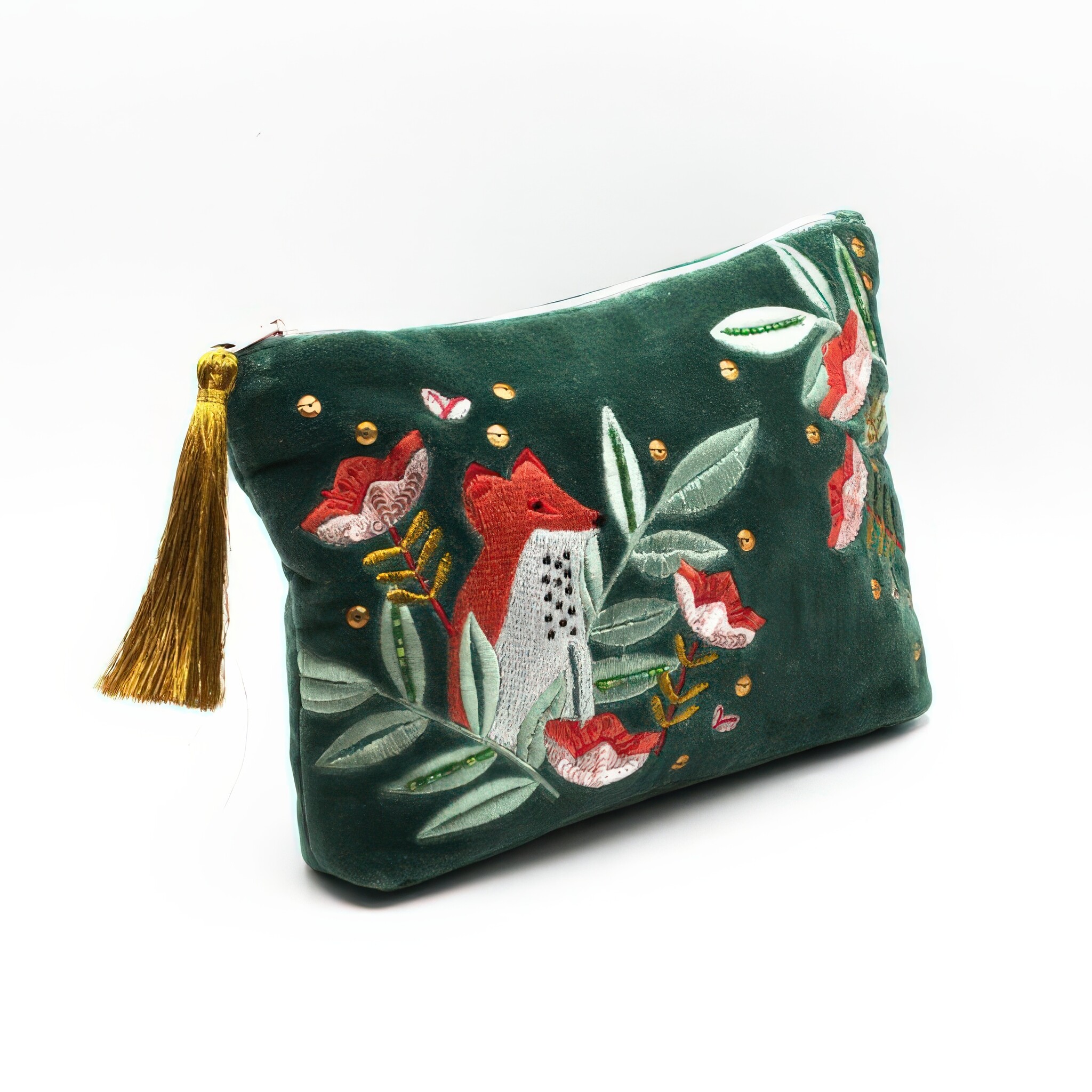 Donkergroene fluwelen make-uptas met een geborduurde vos tussen bloemen, afgewerkt met gouden stiksels en kralen. De achterkant is gemaakt van bijpassend fluweel. Voorzien van een zachte katoenen voering.