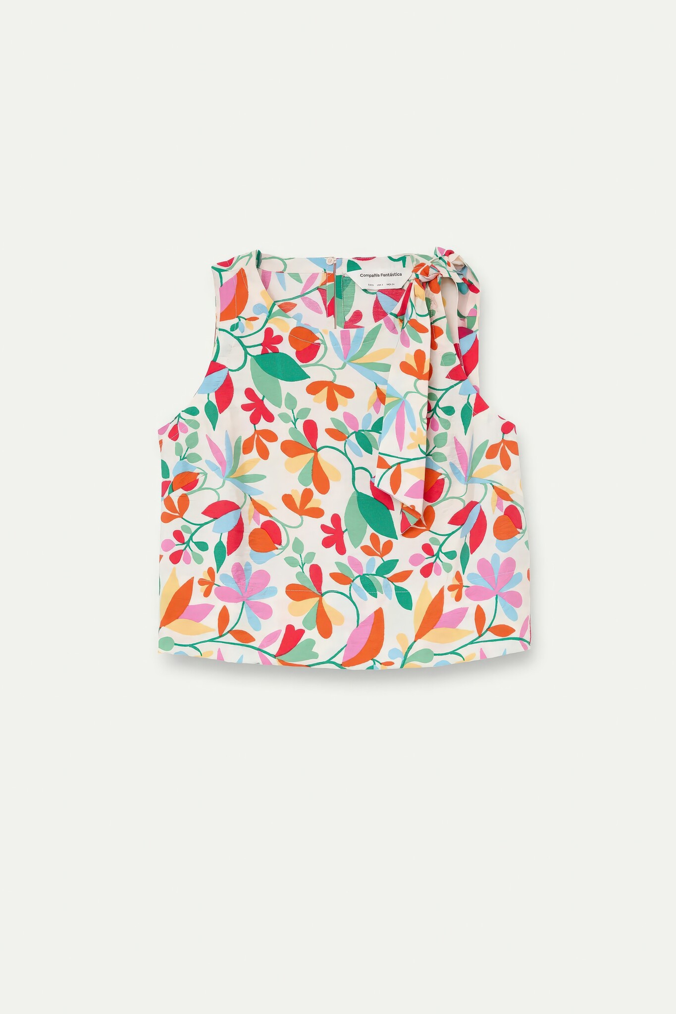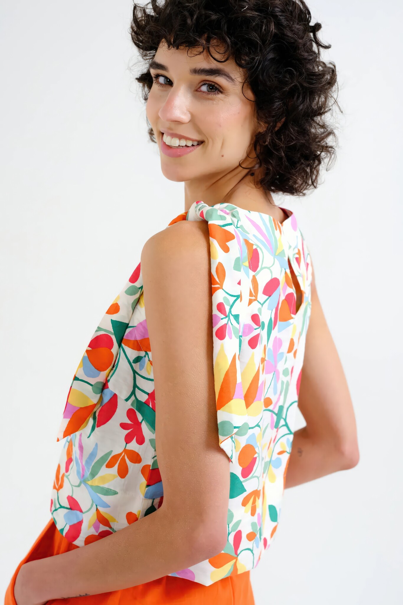 Mouwloze crêpe top met een lotusprint, ronde hals, verborgen knoopsluiting aan de achterkant en een knoop detail op de schouder.