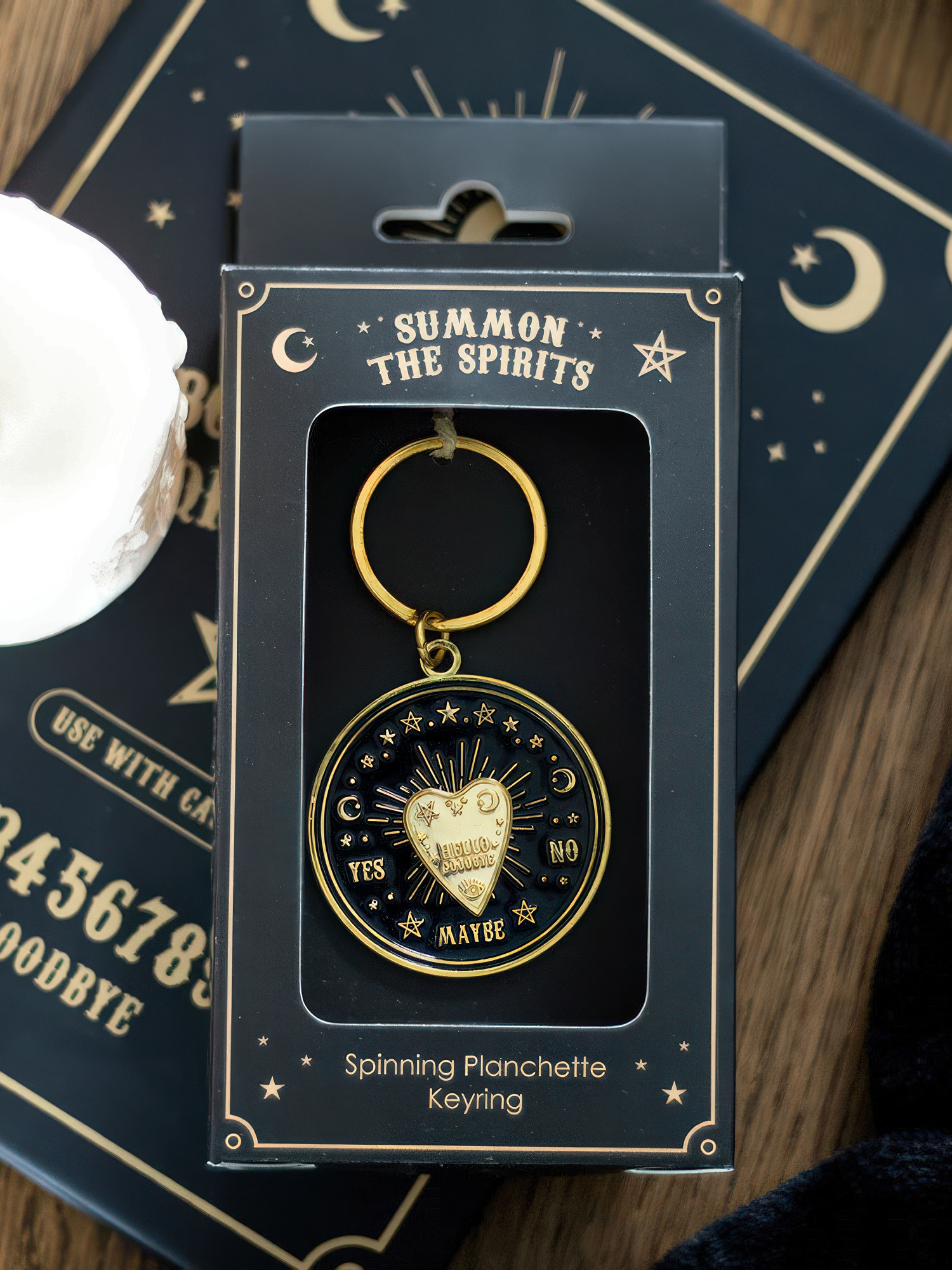 Mystieke sleutelhanger met een goudkleurige metalen planchette-bedel die kan draaien, geïnspireerd op het klassieke spirit board-ontwerp. Geleverd in een bijpassende doos, perfect voor liefhebbers van het bovennatuurlijke.