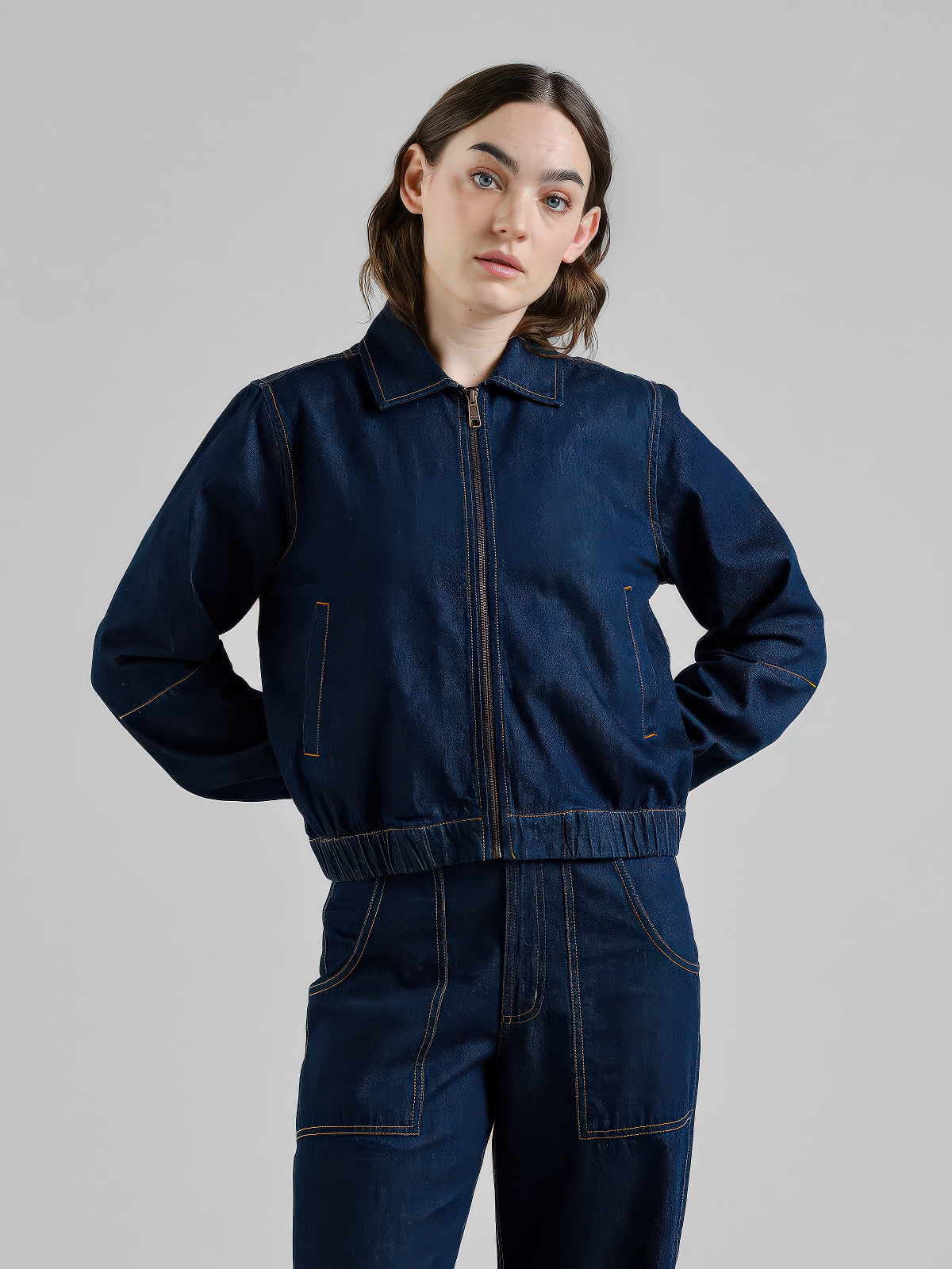 Denim jacket in donkerblauw met een regular fit, overhemdkraag en ritsluiting aan de voorkant. Elastische zoom en manchetten, twee zijnaadzakken en een zonnebloemborduursel op de rug. Tobacco contraststiksels. Gemaakt van biologisch en gerecycled katoen.