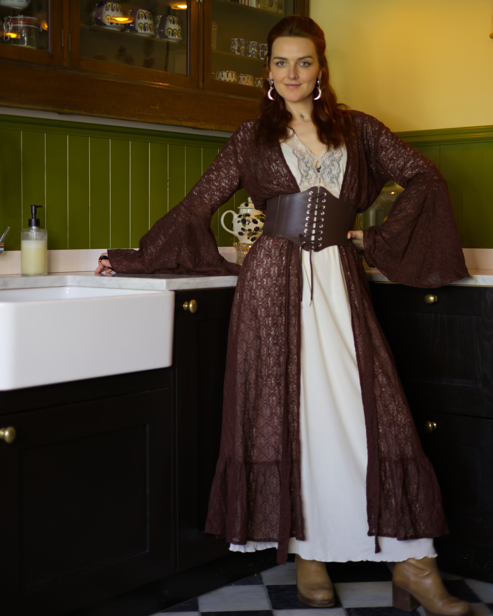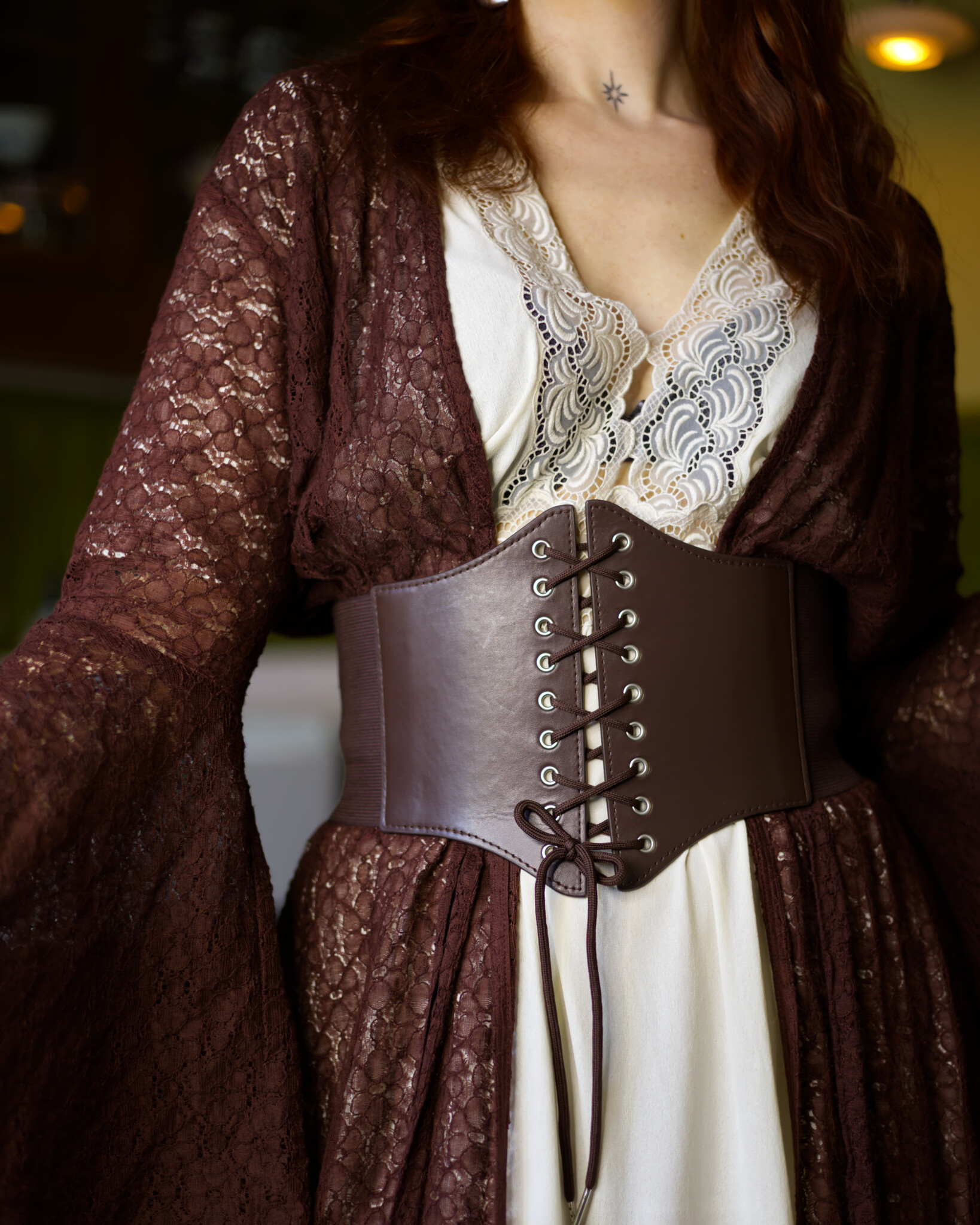 De Aurora jurk is een lange wikkeljurk van prachtig katoenen kant. De rok valt wijd en elegant, terwijl de uitlopende mouwen een betoverende uitstraling geven. Eén maat die zich soepel vormt van XS tot ongeveer XXL, makkelijk te knopen zoals jij wilt.