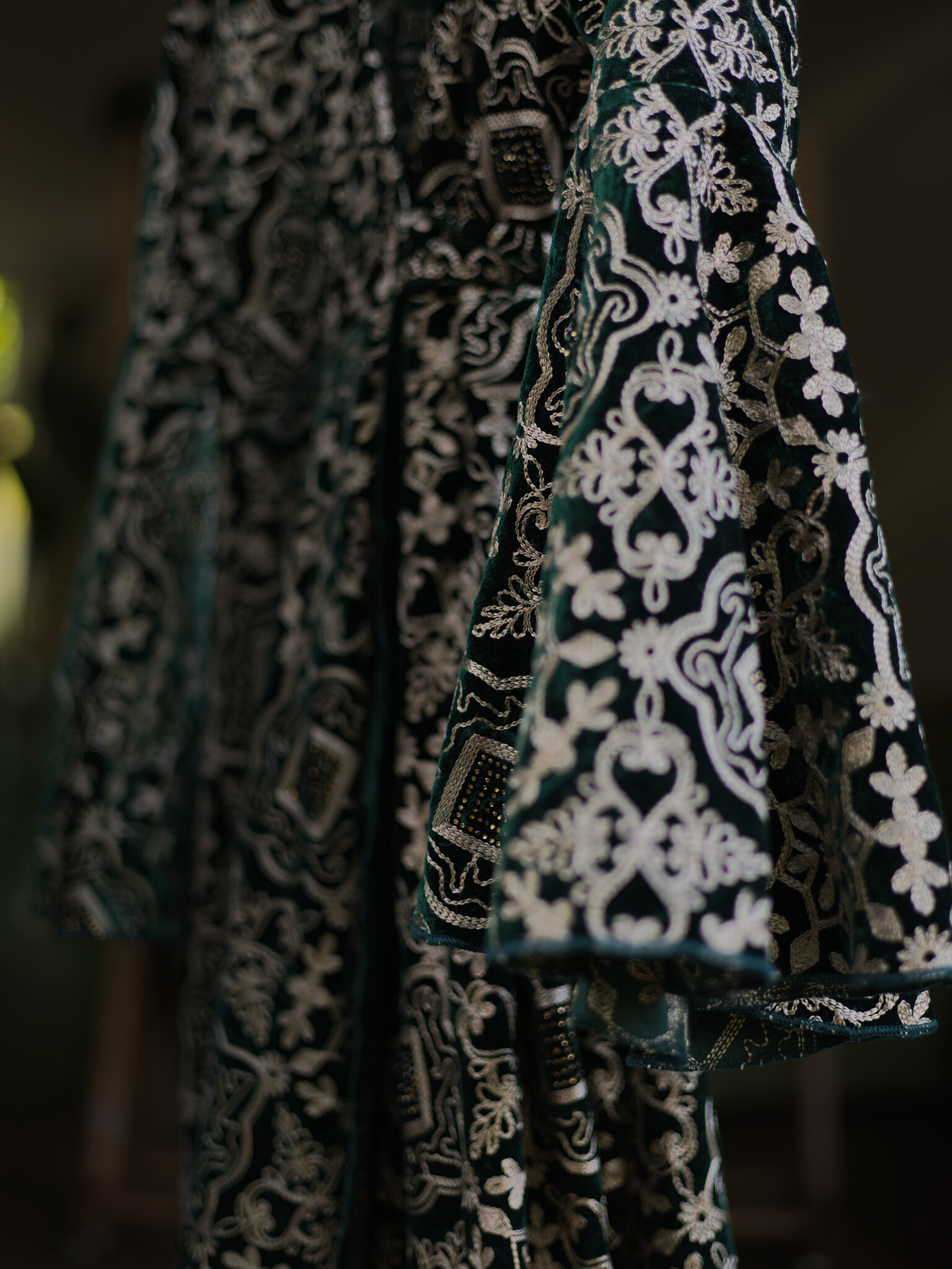 De Aurora jurk is een lange wikkeljurk van prachtig geborduurd groen fluweel. De rok valt wijd en elegant, terwijl de uitlopende mouwen een betoverende uitstraling geven. Eén maat die zich soepel vormt van XS tot ongeveer XXL, makkelijk te knopen zoals jij wilt.