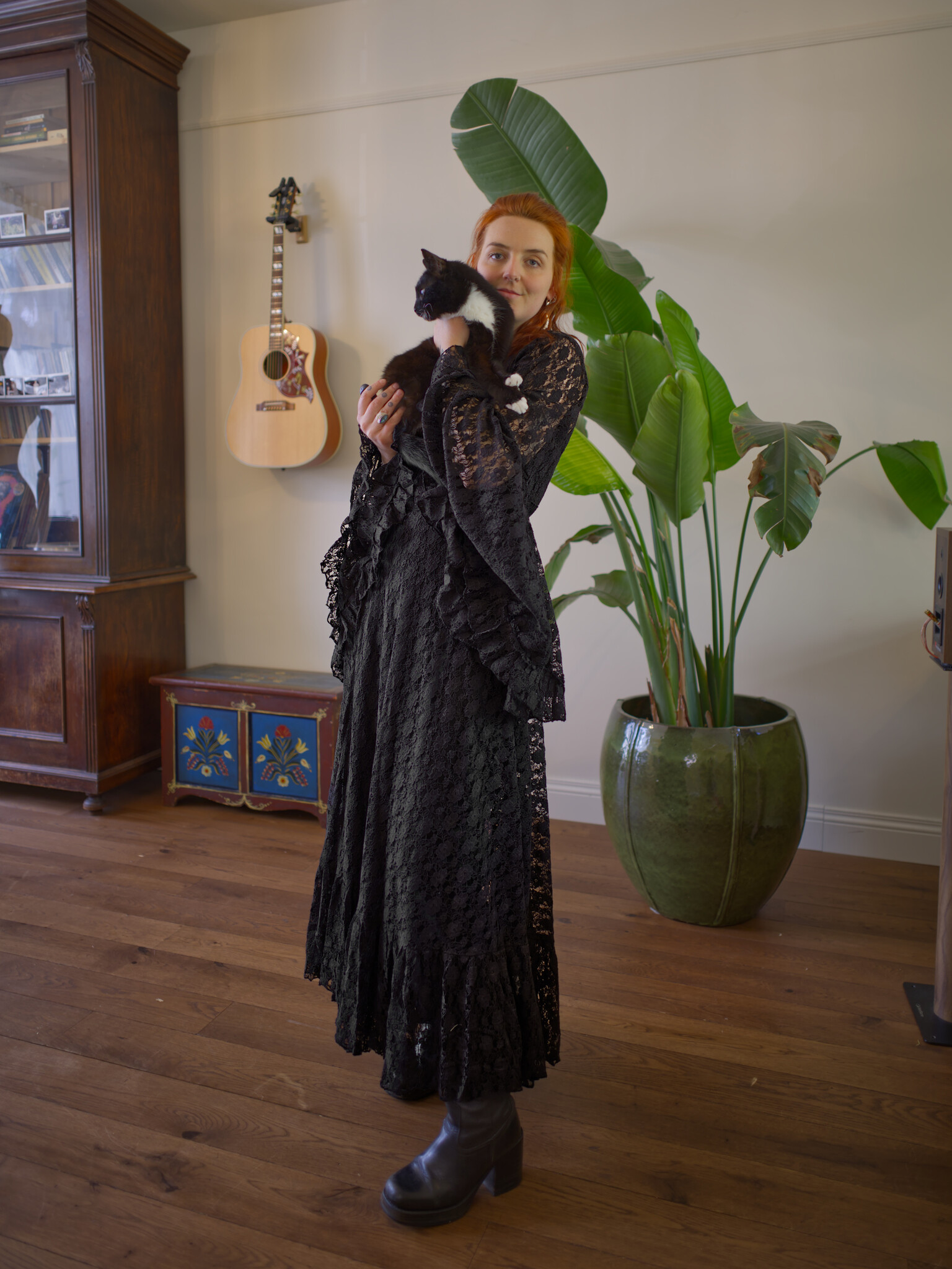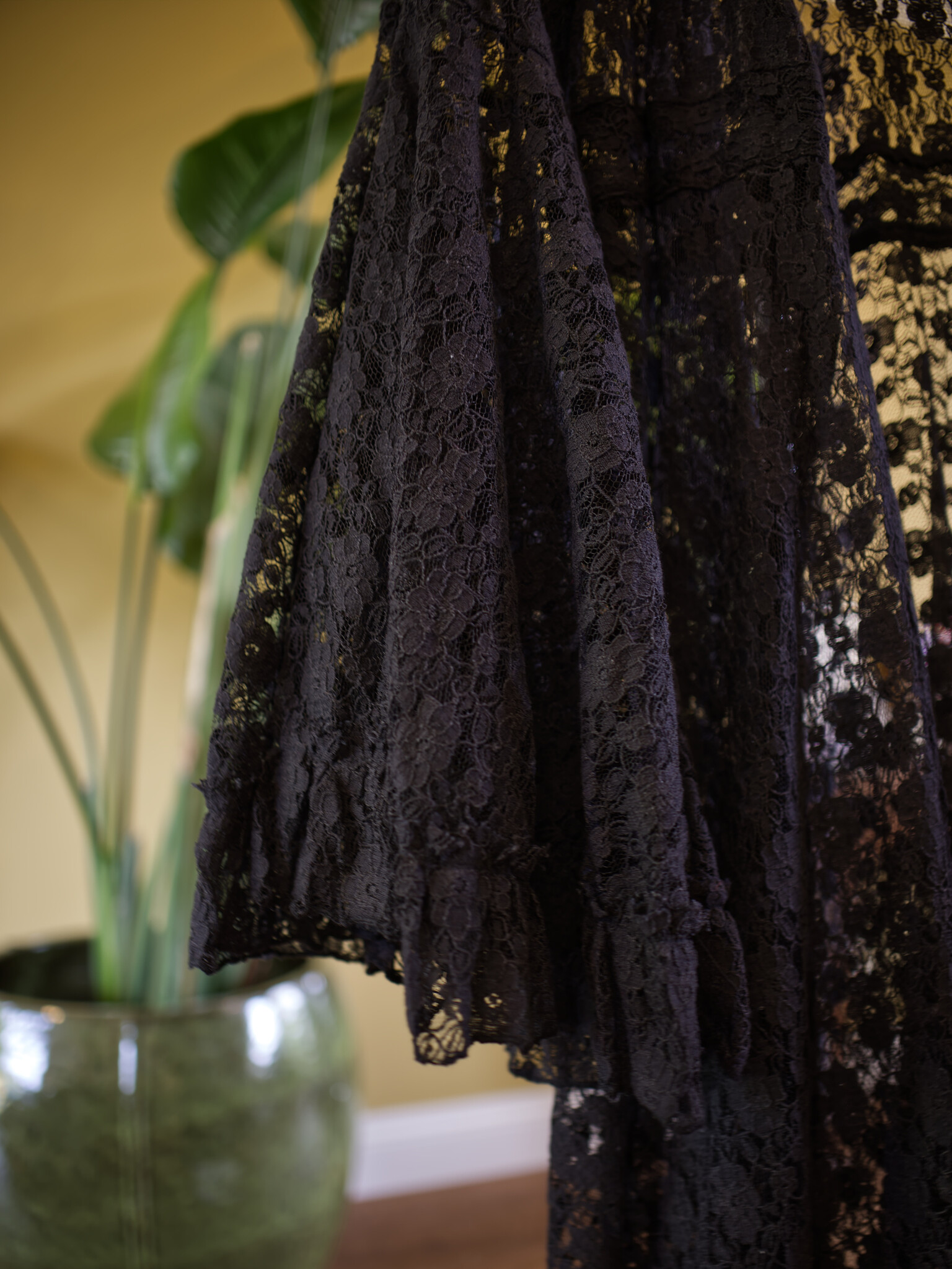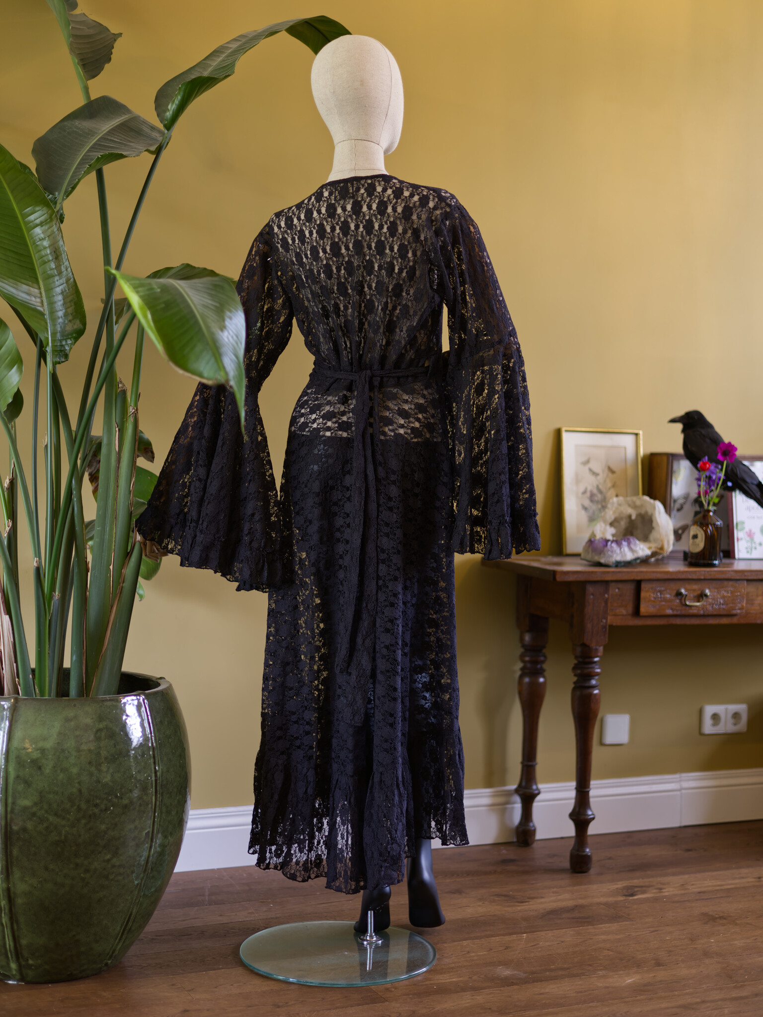 De Florence jurk is een luxe wikkeljurk, handgemaakt van kant. De rok valt wijd en elegant, terwijl de grote klokmouwen dansen om je polsen en zo een betoverende uitstraling geven. Eén maat die zich soepel vormt van S tot ongeveer XXL, makkelijk te knopen zoals jij wilt.