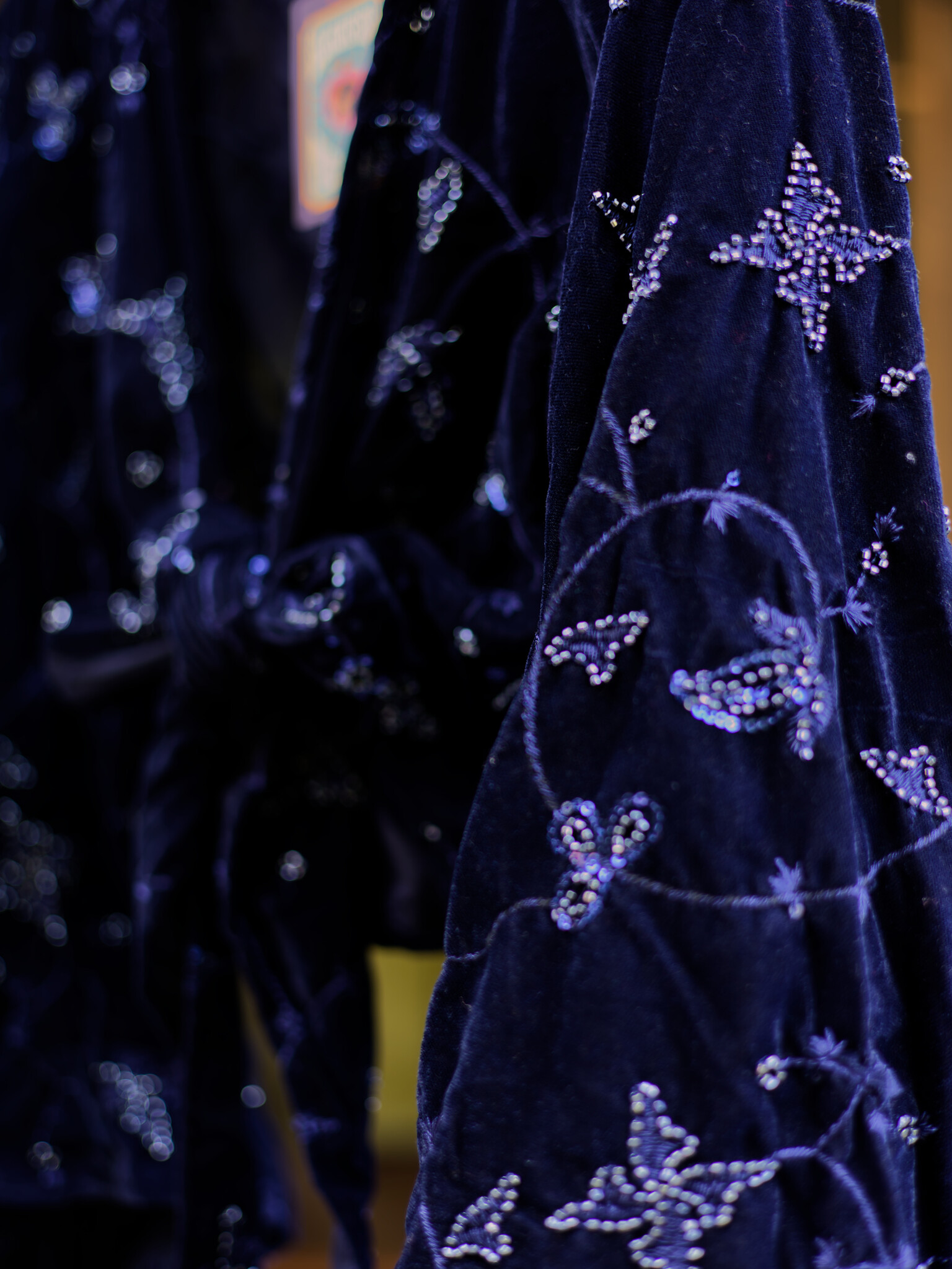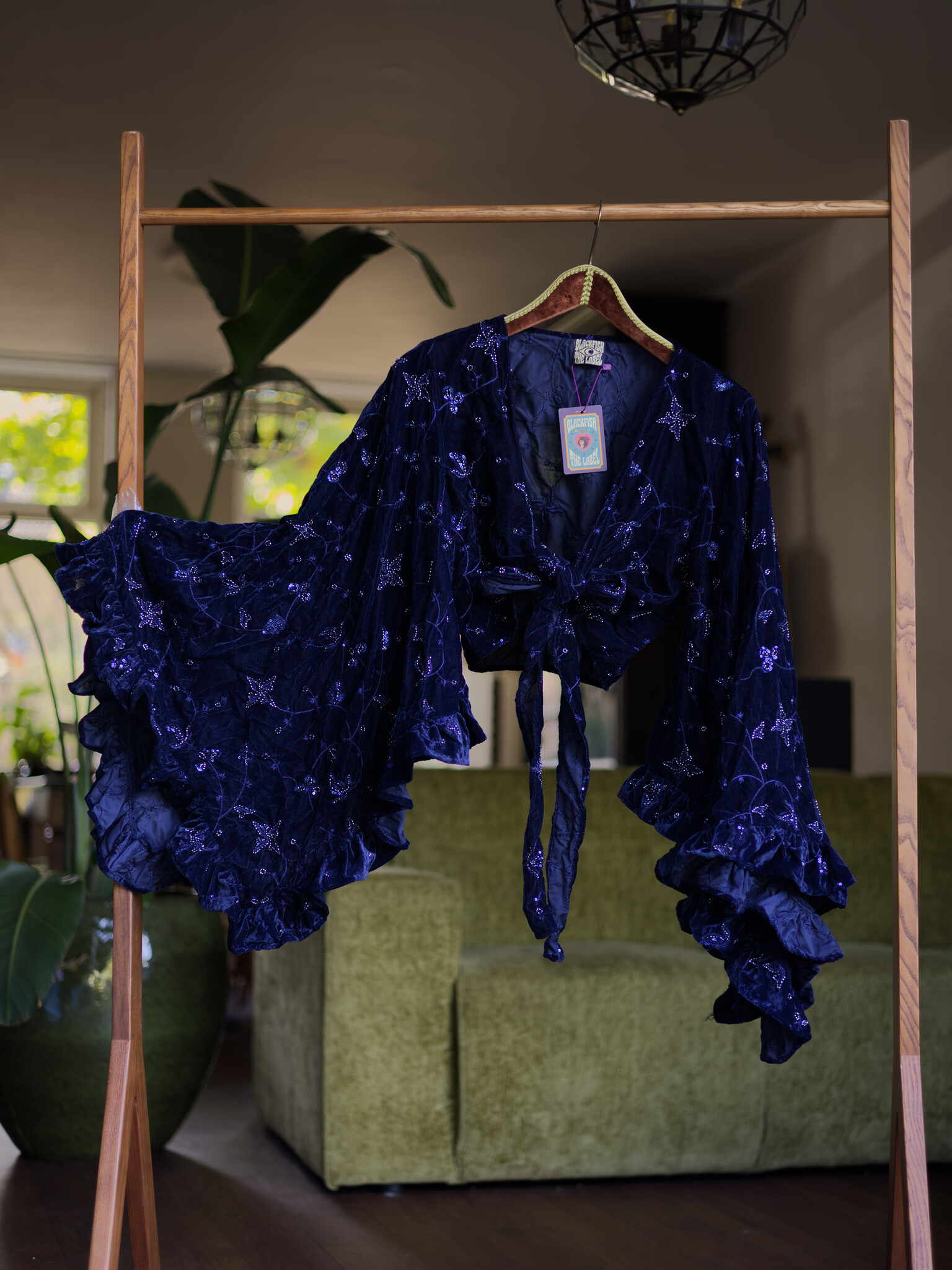 Gehuld in de betovering van Ethereal fluweel, vangt de Lilith blouse de mystiek van een sterrennacht. Fijne borduursels lichten op als fonkelende sterren, geweven in diep nachtblauw. Zacht als een fluistering, tijdloos als de nacht zelf.