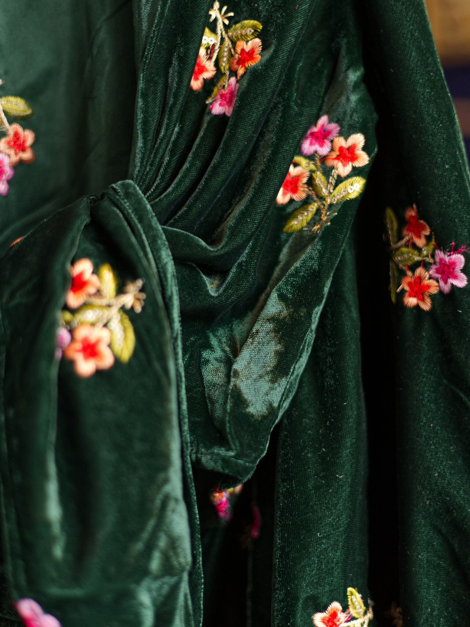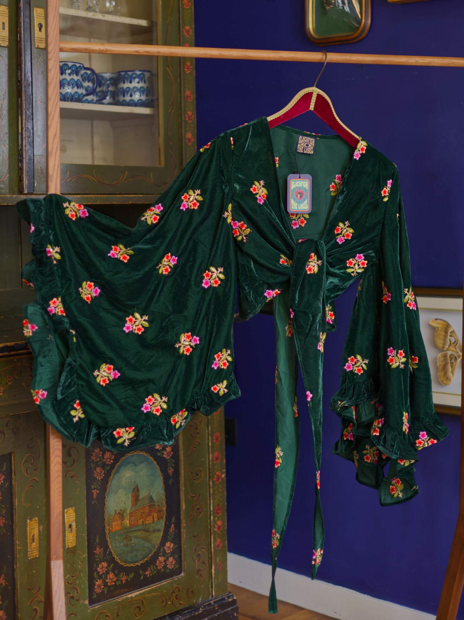 Ontdek onze handgemaakte blouse, prachtig gemaakt van geborduurd fluweel en een kenmerkend stuk van ons eigen label