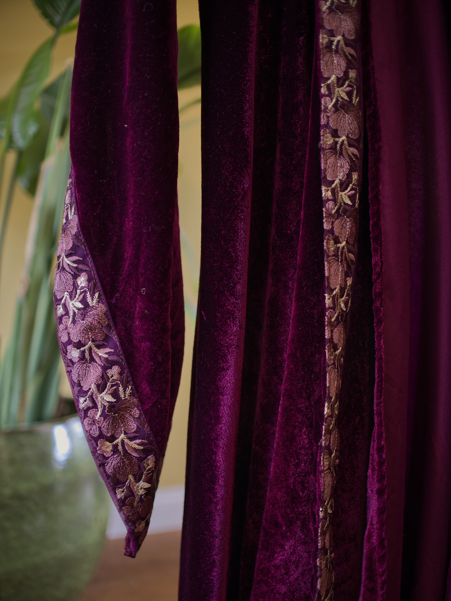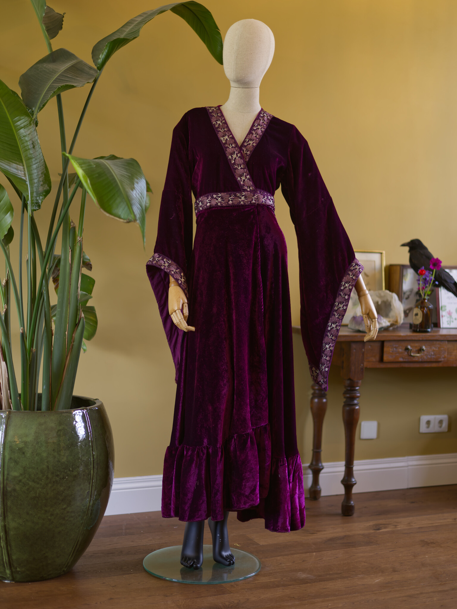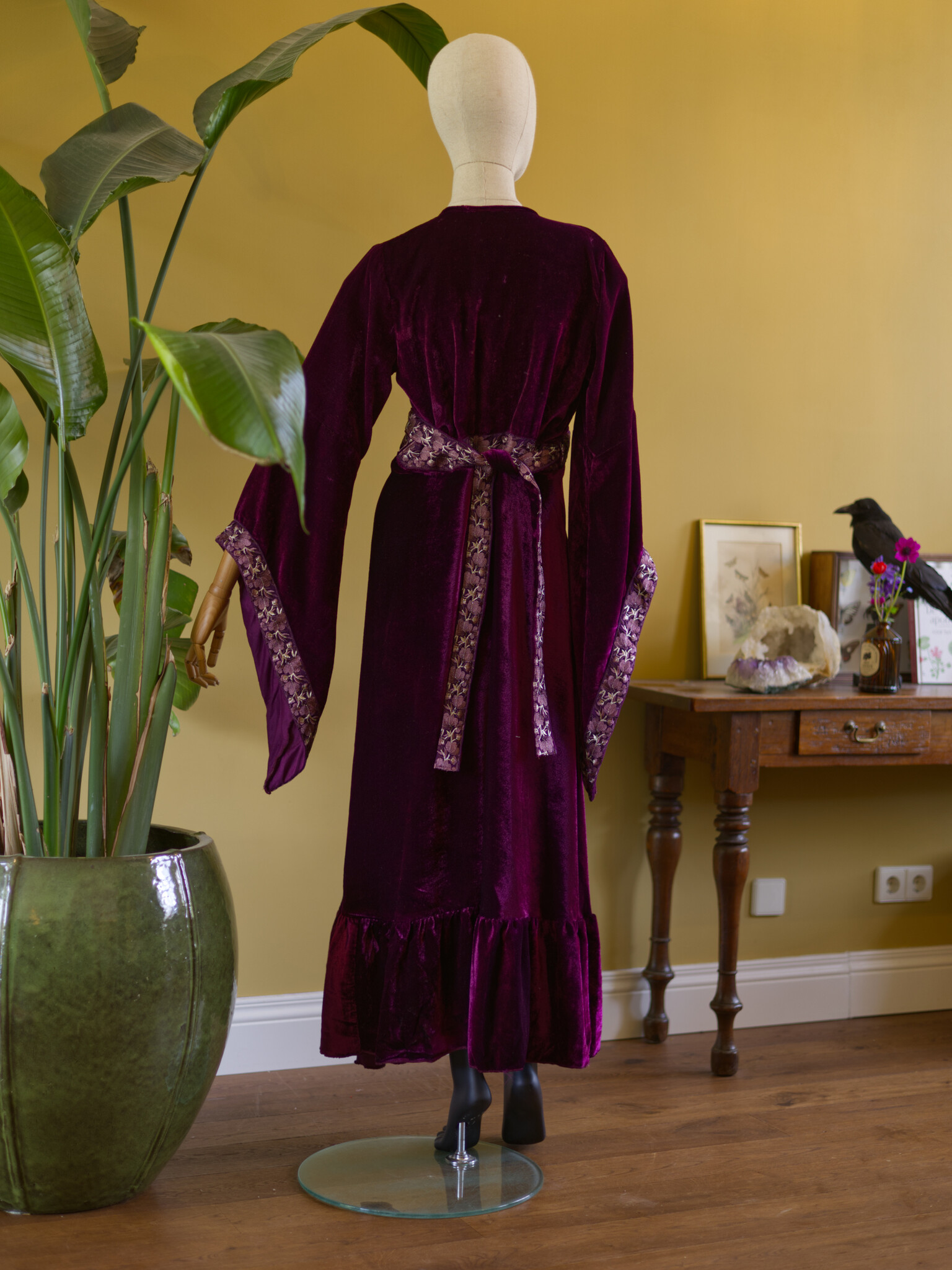De Ritual jurk is een luxe wikkeljurk, handgemaakt van fluweel en afgewerkt met een geborduurde border. De rok valt wijd en elegant, terwijl de lange punt mouwen een betoverende uitstraling geven. Eén maat die zich soepel vormt van XS tot ongeveer XXL, makkelijk te knopen zoals jij wilt.