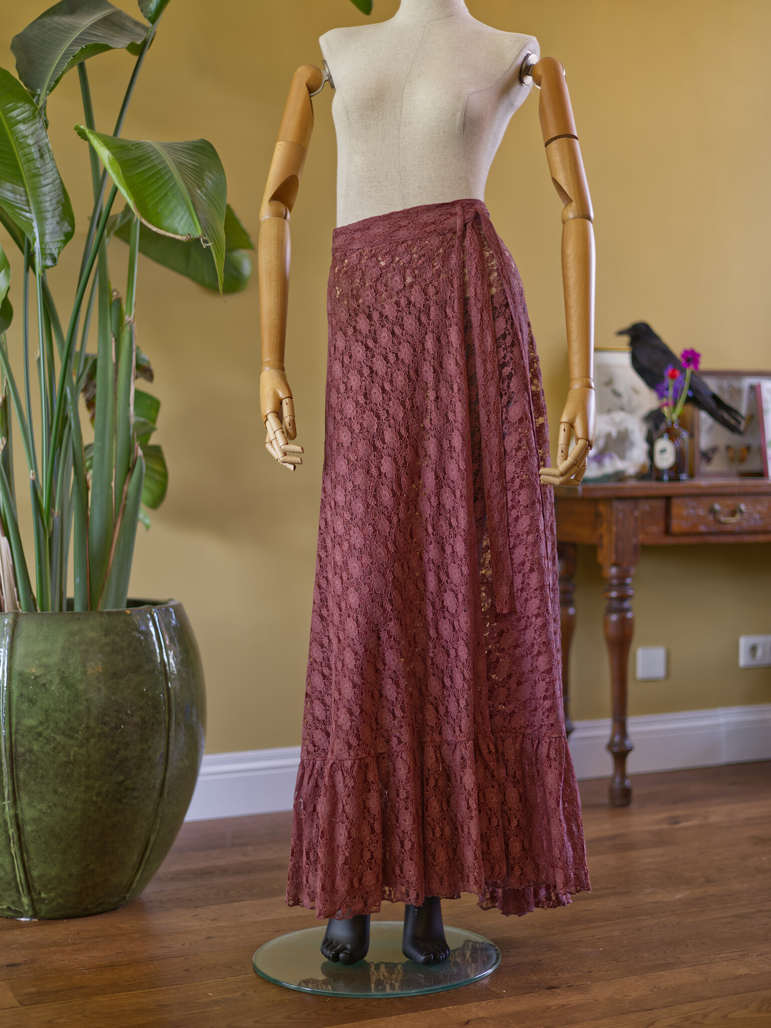 De Sabbath rok is een luxe wikkelrok, handgemaakt van kant. De wijde overslag rok danst om je enkels en geeft zo een betoverende uitstraling. Eén maat die zich soepel vormt van XS tot ongeveer XXL, makkelijk te knopen zoals jij wilt.