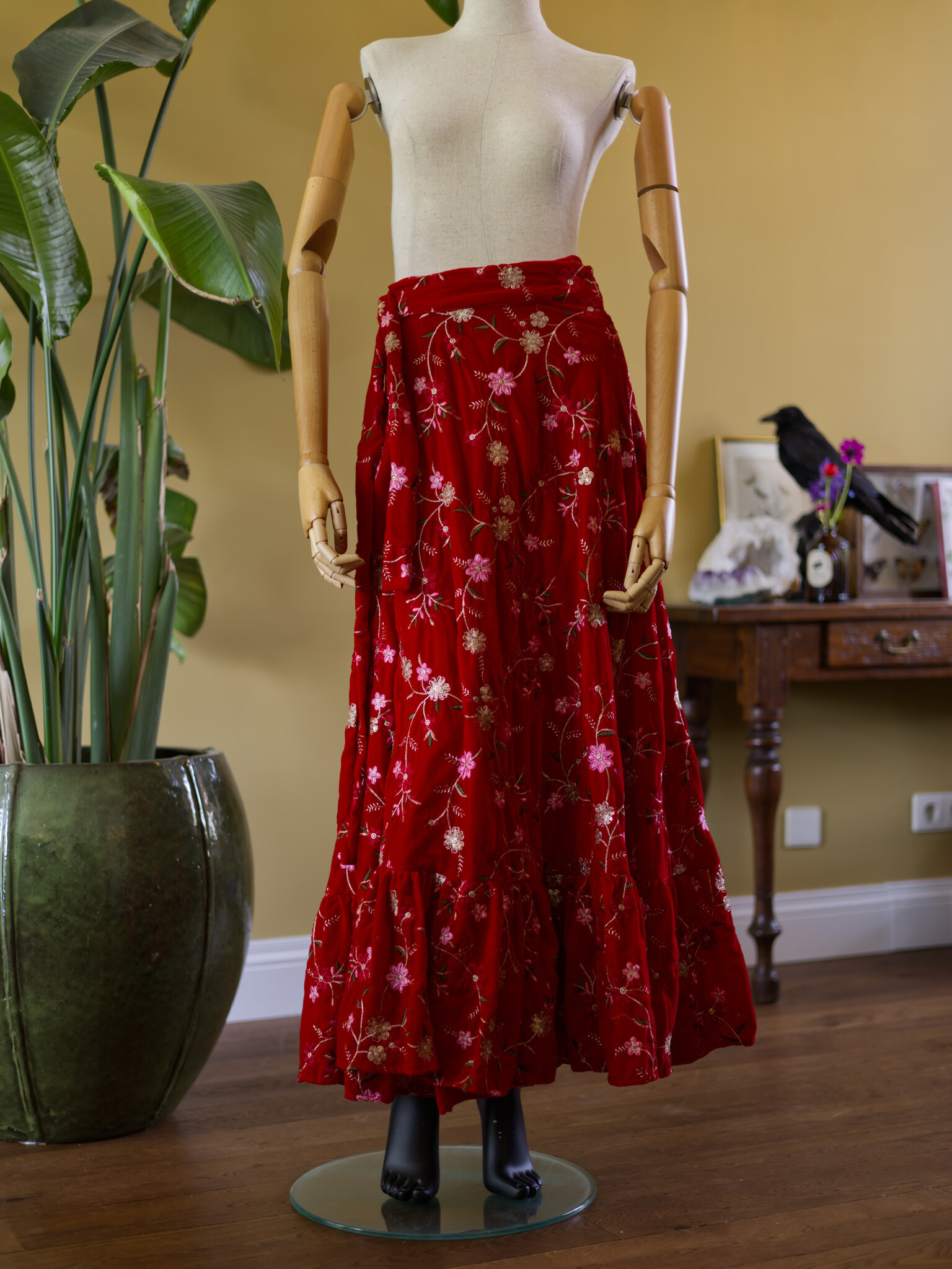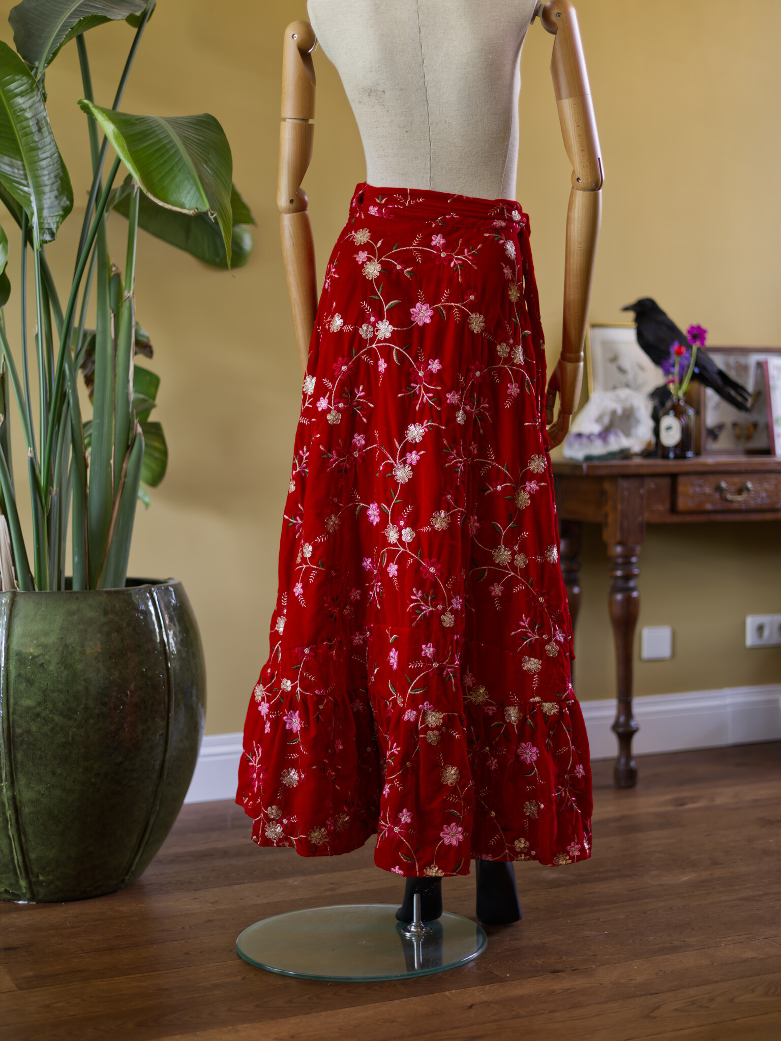De Seance rok is een lange wikkelrok van rijk geborduurd rood fluweel, met een zweem mysterie. Eén maat die zich eenvoudig vormt van XS tot ongeveer XXL. Combineer haar met een korset of blouse voor een dramatisch silhouet, of laat haar zacht meebewegen onder een oversized knit.