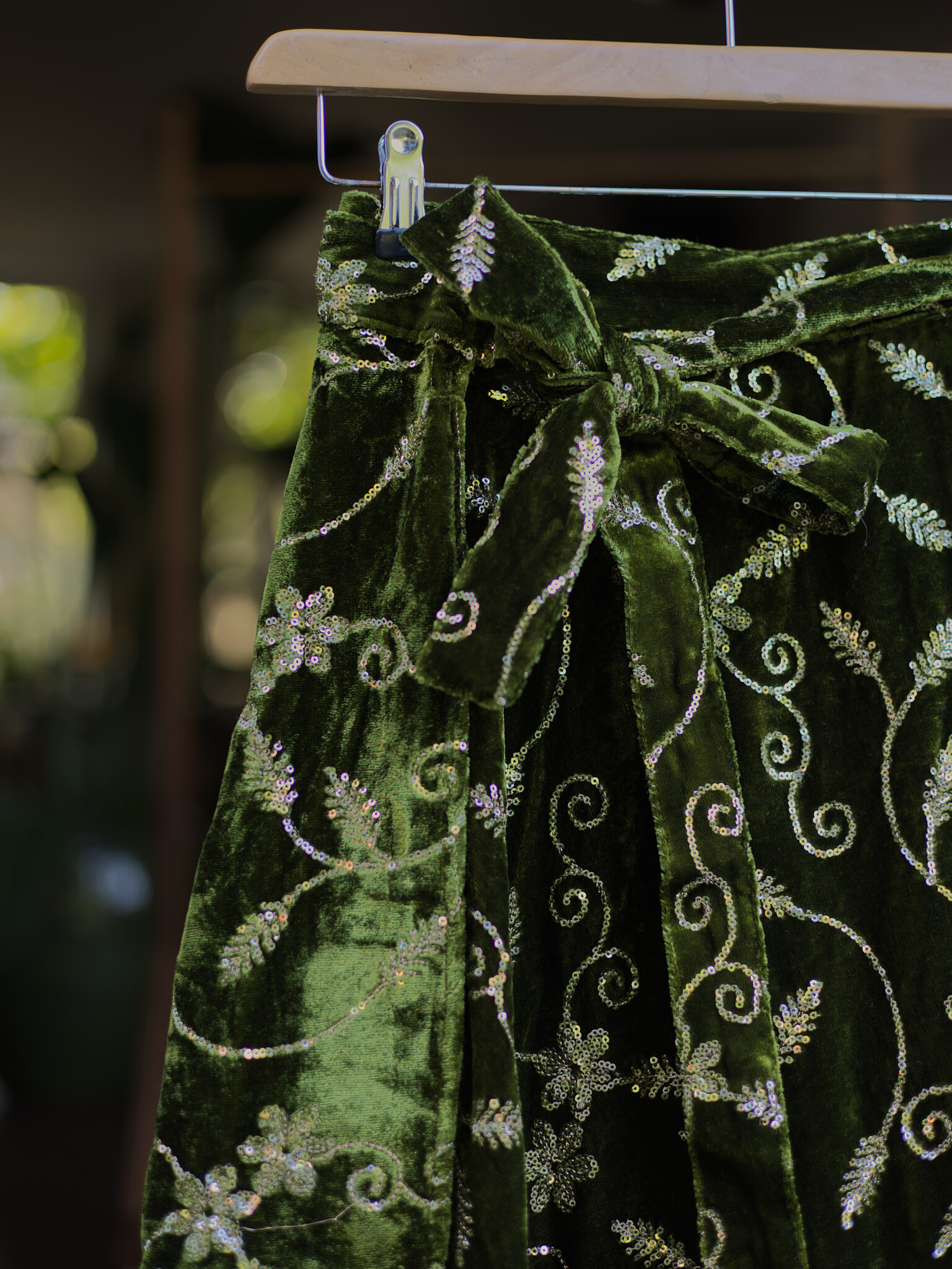 De Seance rok is een lange wikkelrok van rijk geborduurd groen fluweel, met een zweem mysterie. Eén maat die zich eenvoudig vormt van XS tot ongeveer XXL. Combineer haar met een korset of blouse voor een dramatisch silhouet, of laat haar zacht meebewegen onder een oversized knit.