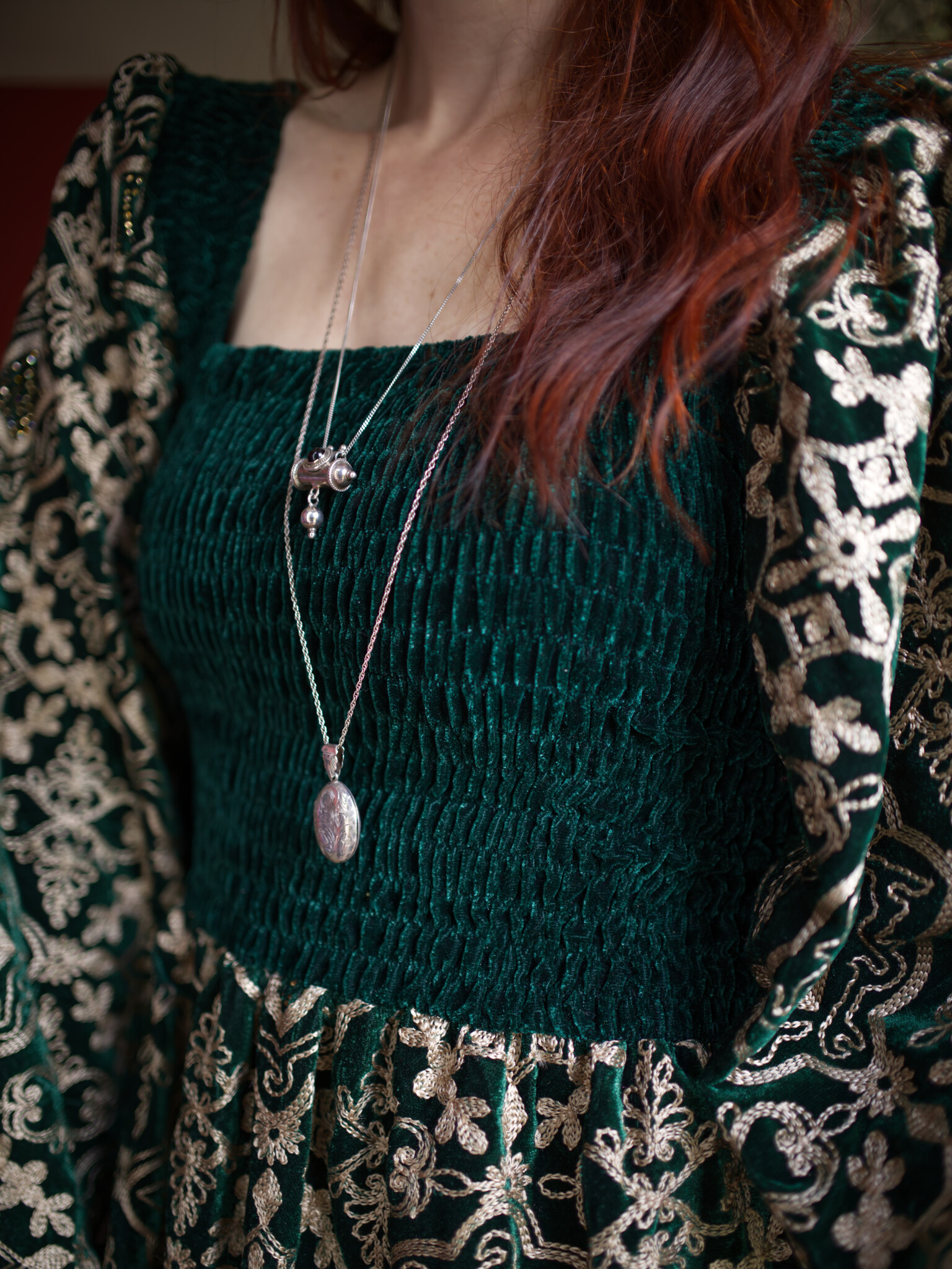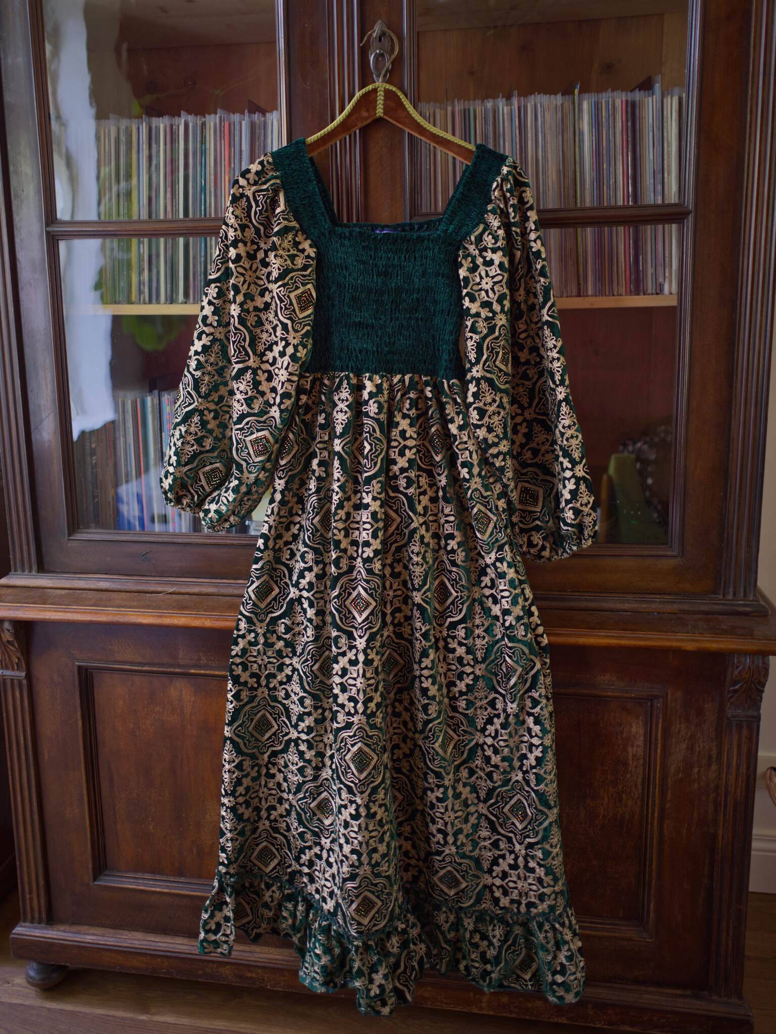 Maak kennis met onze Solstice-jurk: een waar meesterwerk van geborduurd fluweel, met een gesmockte fluwelen buste die als een droom zit. De volumineuze ballonmouwen zorgen voor een betoverende flow, terwijl de lange rok je innerlijke waarzegster naar voren brengt.