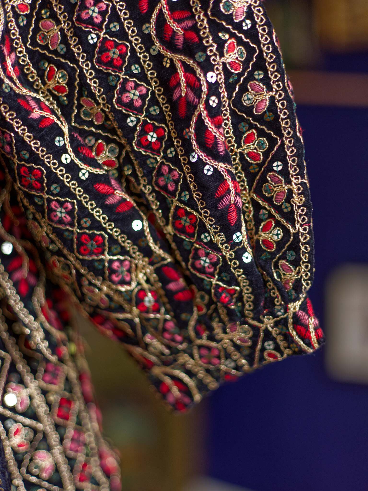LET OP: Ga voorzichtig om met deze delicate stof; geborduurde draden kunnen losraken en pailletten kunnen scherp zijn en schade veroorzaken bij wrijving.