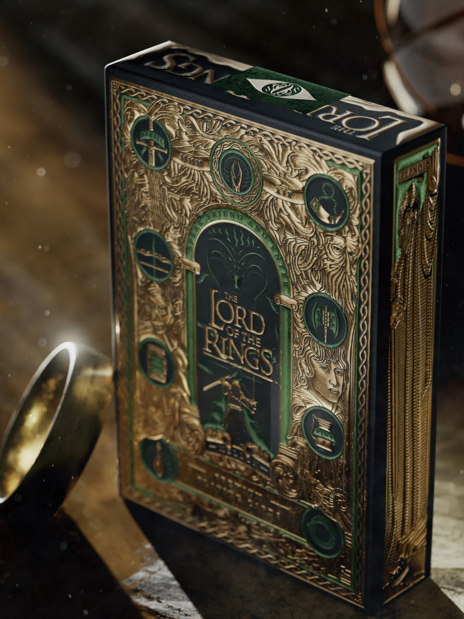 Premium kaartspel met iconische personages uit The Lord of the Rings trilogie. Gedetailleerd ontwerp geïnspireerd door hun reis van The Shire naar Mordor. Luxe verpakking met goud- en smaragdgroene accenten.