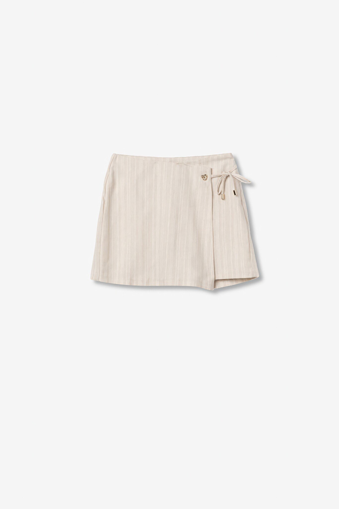 Skort met wrapdesign, subtiel streeppatroon, knoopdetail en zijdelingse striksluting. Beige.