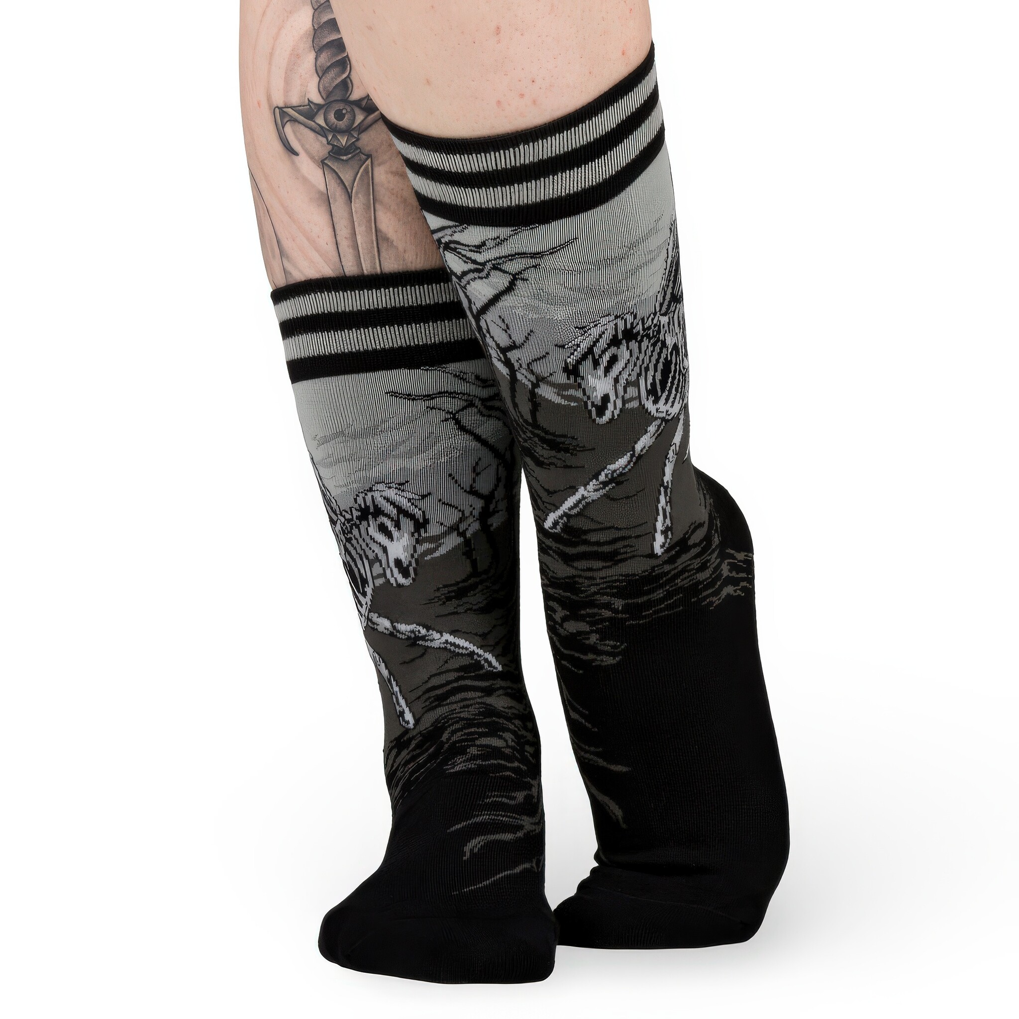 Sokken met illustratie geïnspireerd op The Vision of Death van Gustave Doré (ca. 1868). Dood op een vliegend skeletpaard boven een dor landschap.