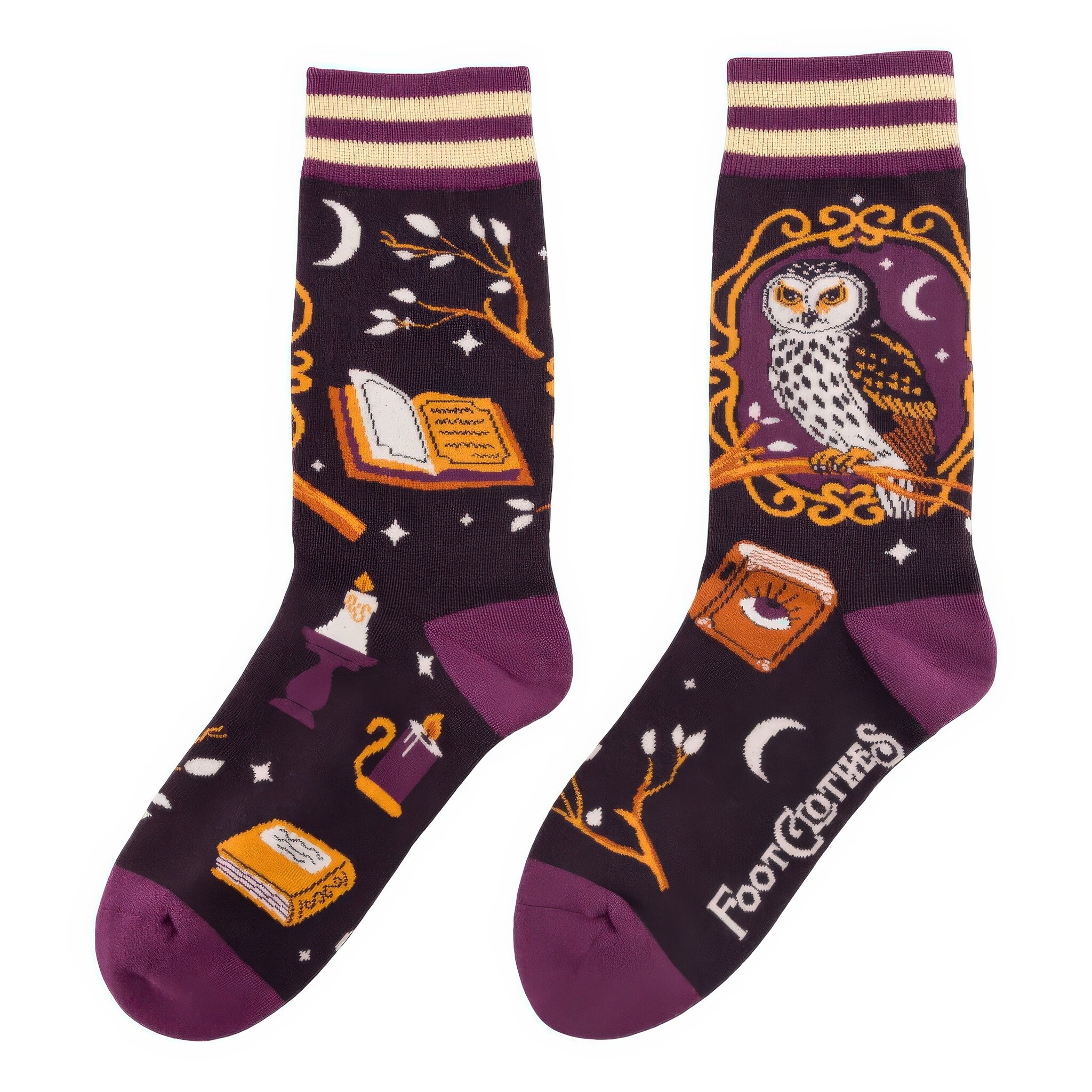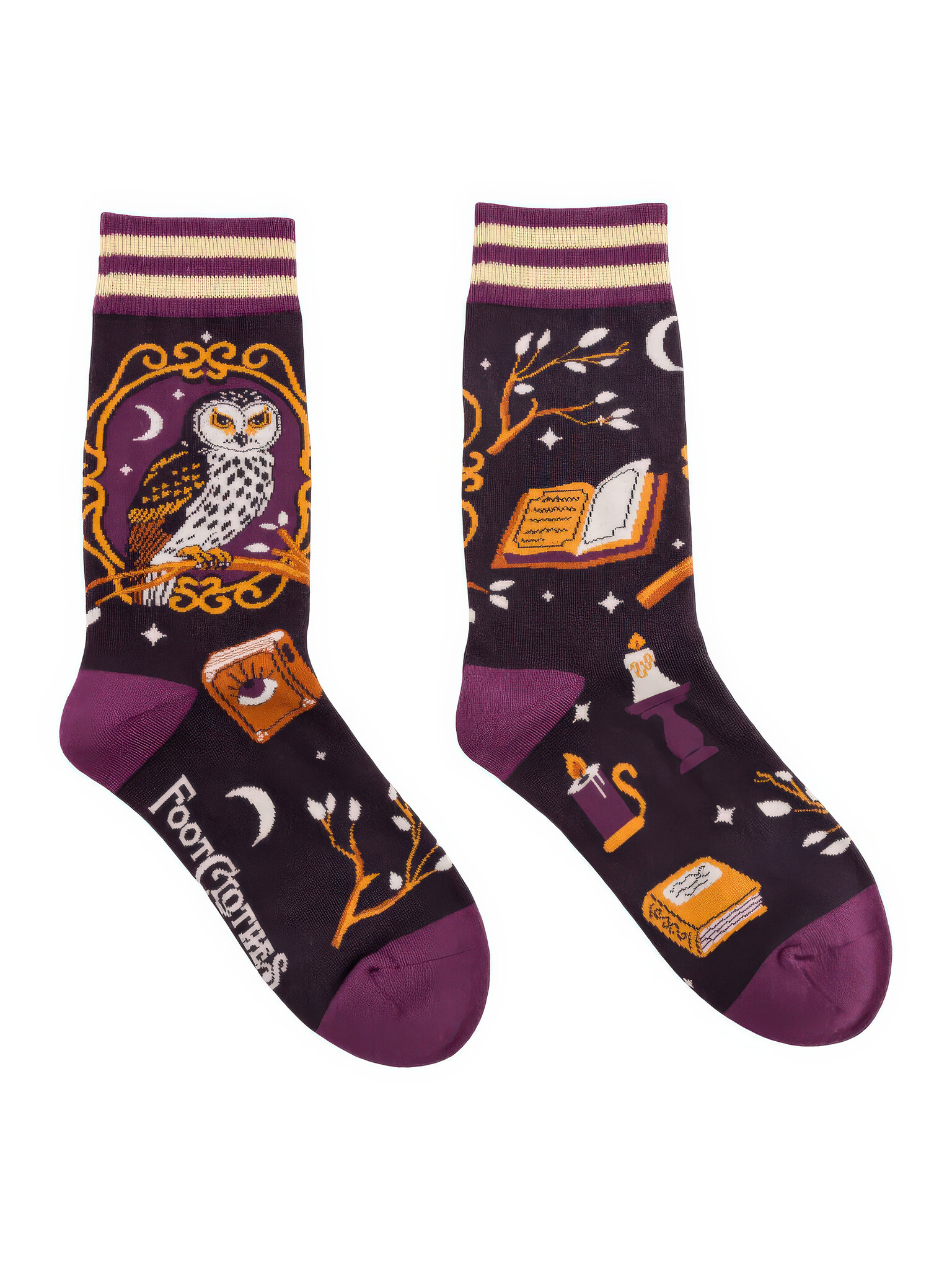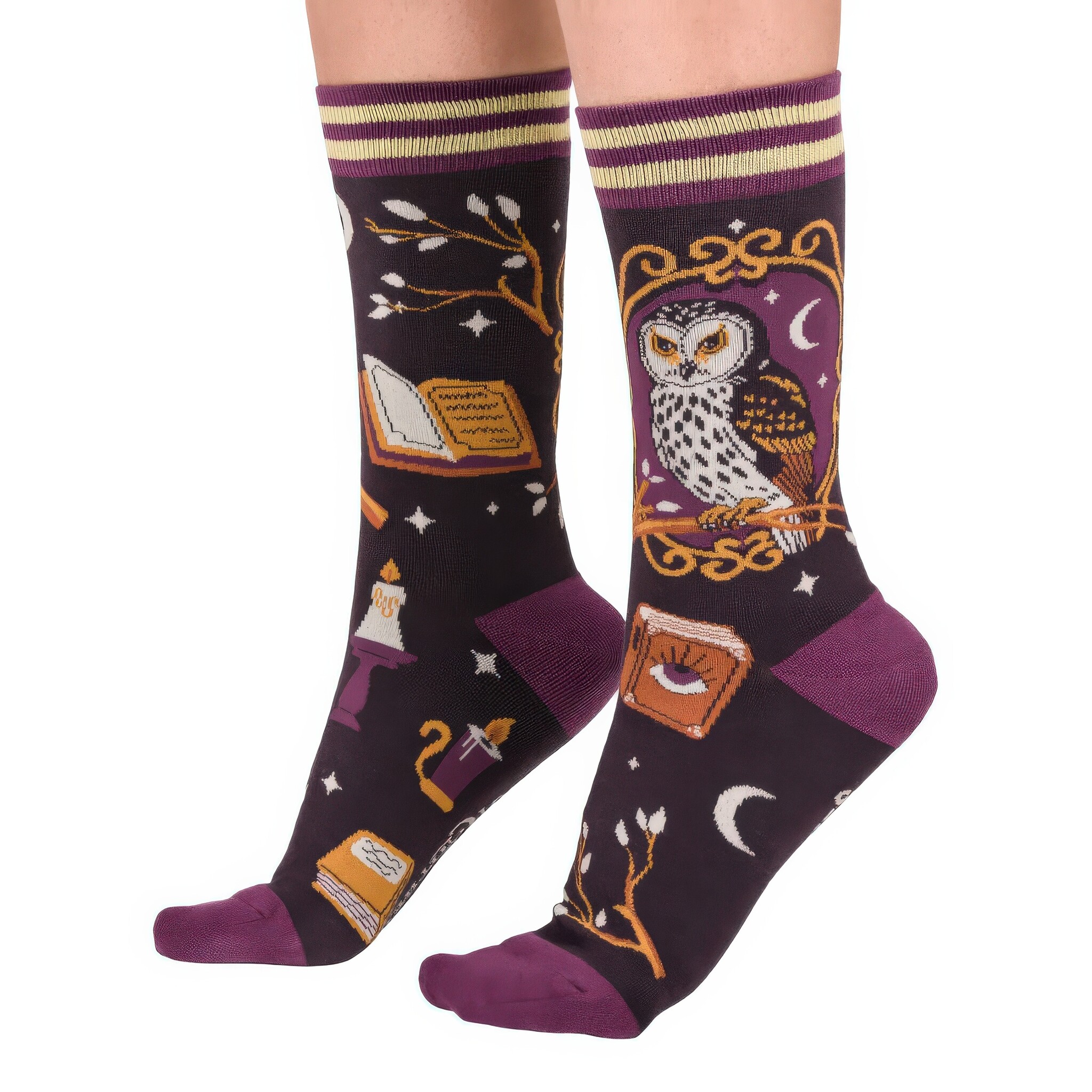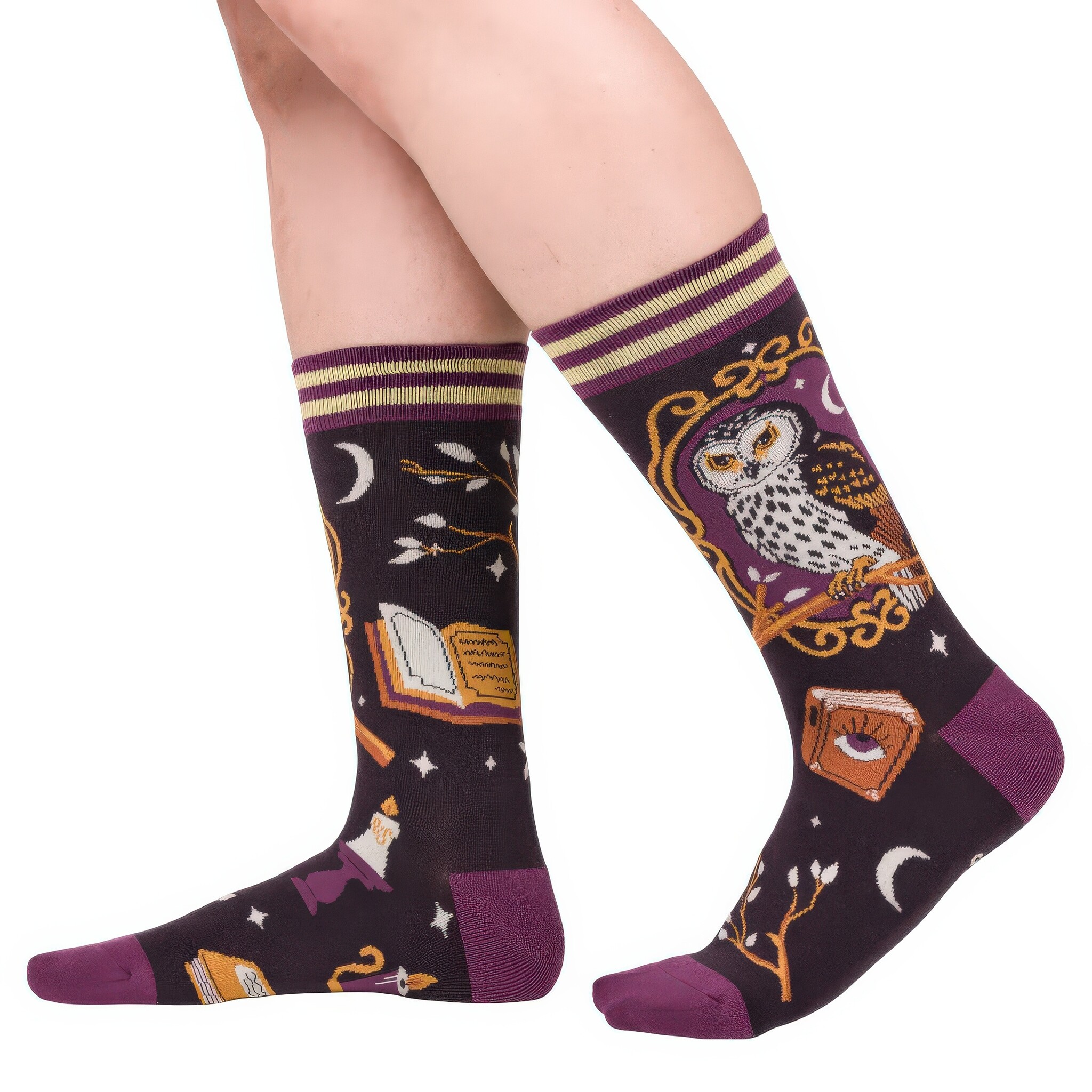Sokken met een uil in strenge portretstijl. Een scherpziende blik en klassieke outfit voor wie houdt van observatie en orde.