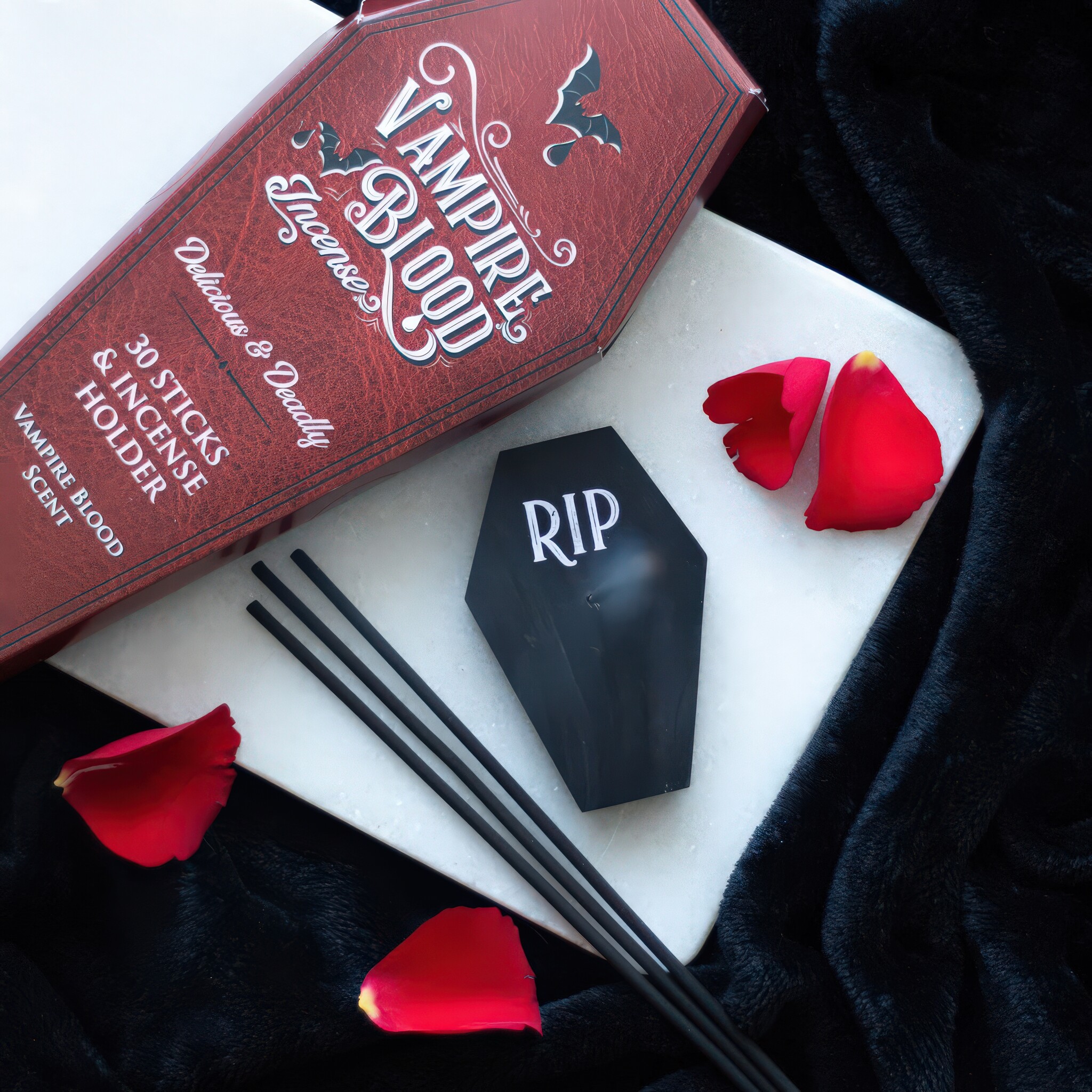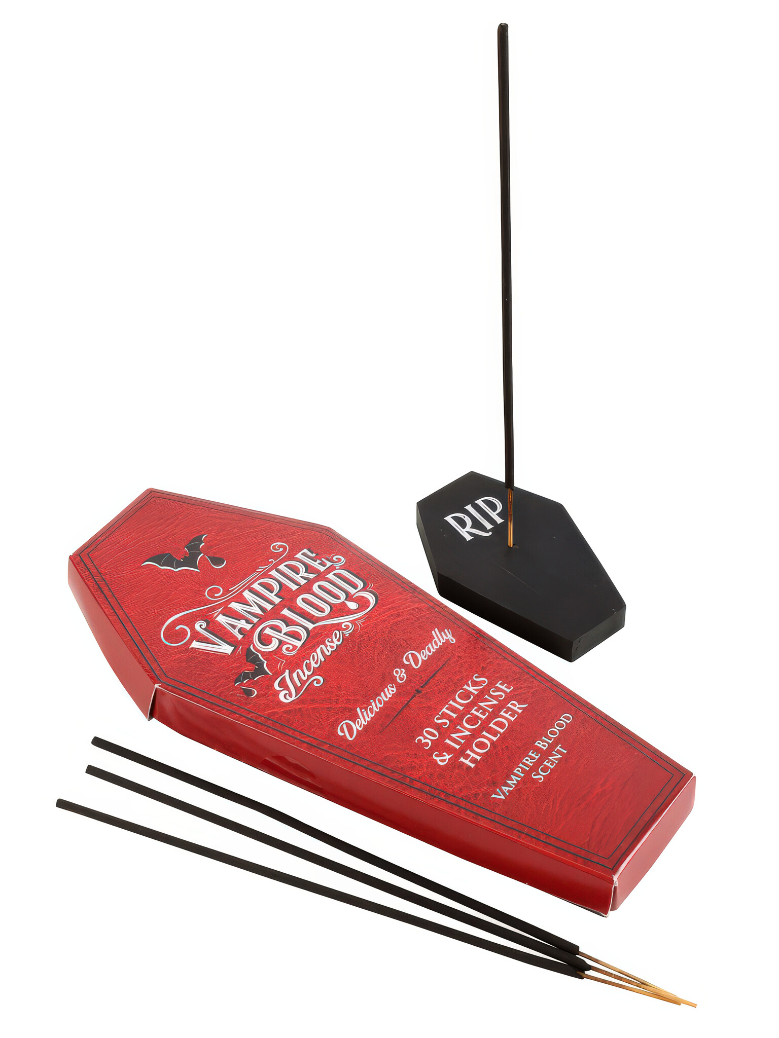 Deze set van 18 Vampire Blood wierookstokjes komt in een doodskistvormige verpakking en bevat een bijpassende wierookhouder. Elke verpakking bevat 30 hoogwaardige wierookstokjes met een mysterieuze geur. Ideaal voor meditatie of om een mystieke sfeer te c...
