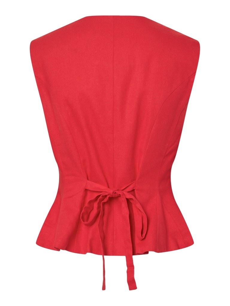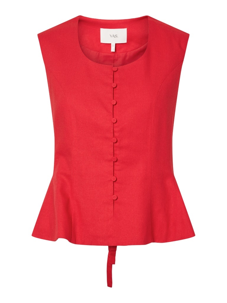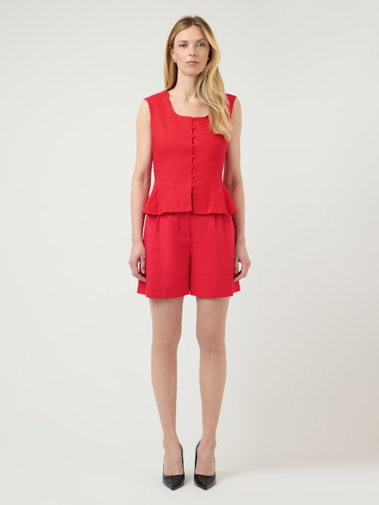 Mouwloze top in poinsettia rood met een vierkante hals, knoopsluiting aan de voorkant met stofknopen en een peplumzoom. Regular fit.
