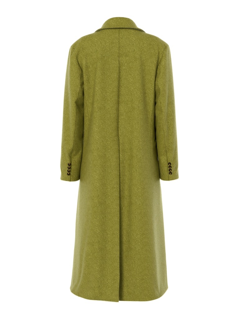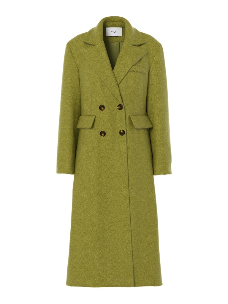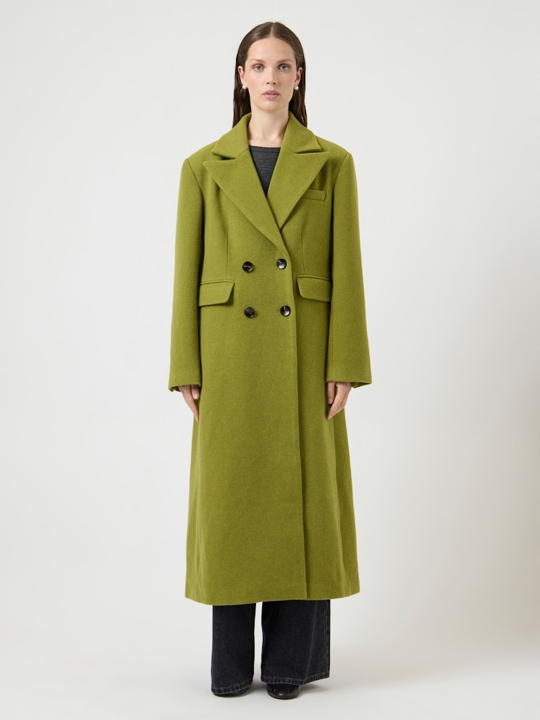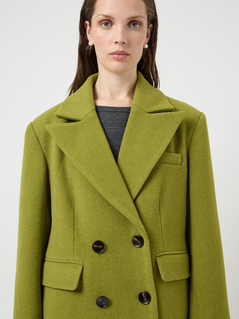 Lange jas in een wolmix met knoopsluiting en voorzakken. Uitgevoerd met een gladde structuur en een rechte pasvorm.