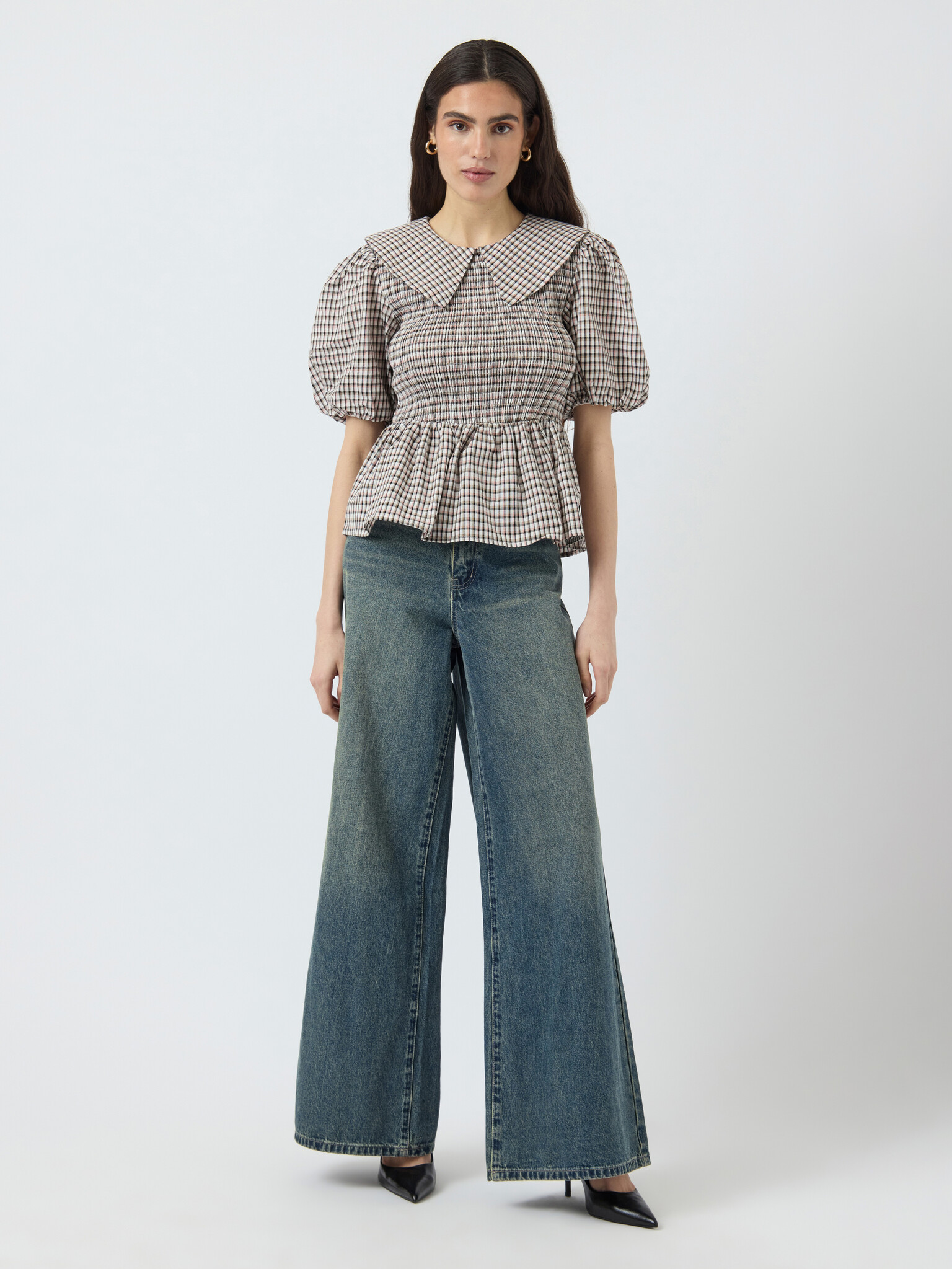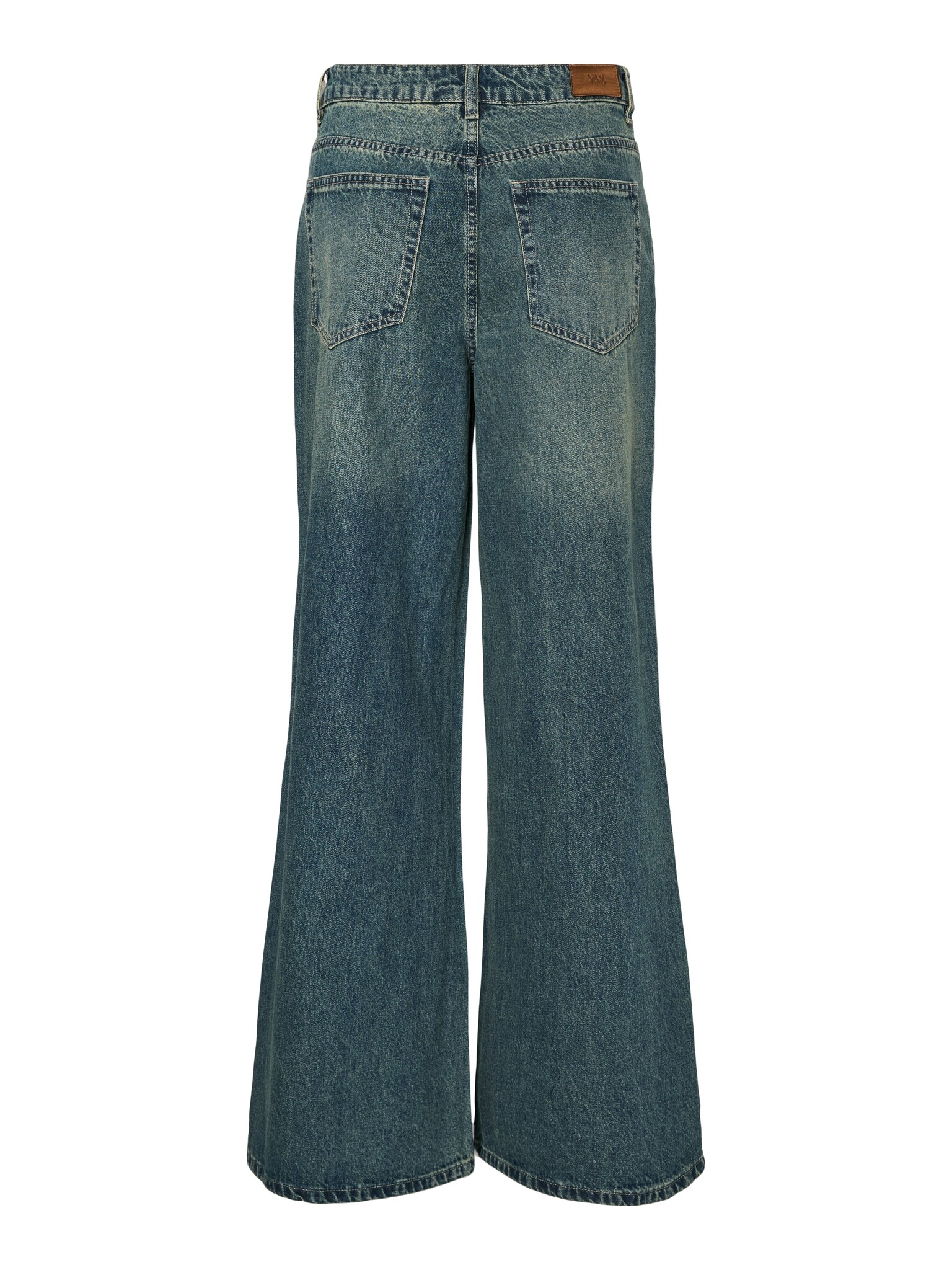 Jeans in mediumblauwe denim met rechte pasvorm, hoge taille en vijfzakkenmodel, gemaakt van biologisch katoenmix.